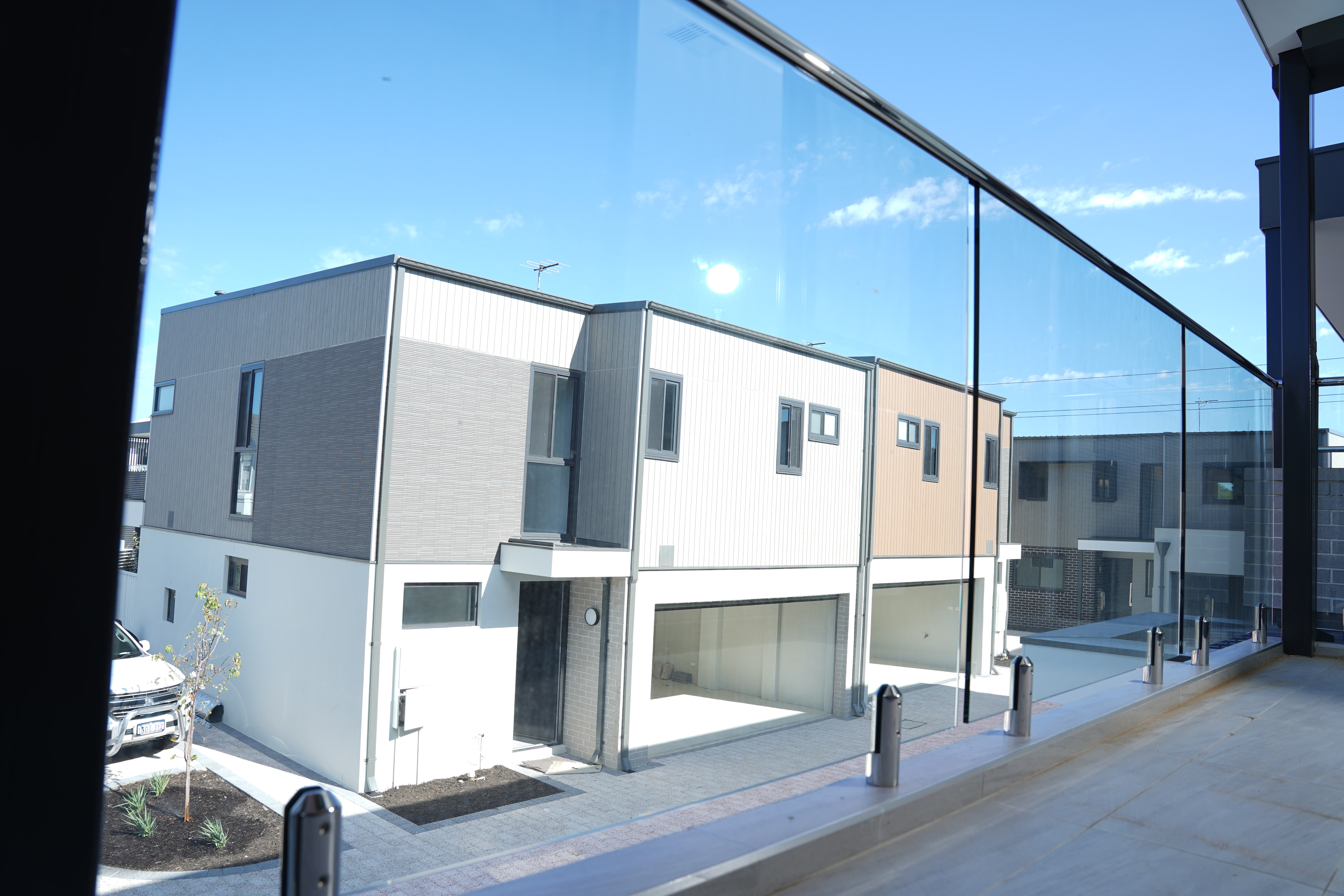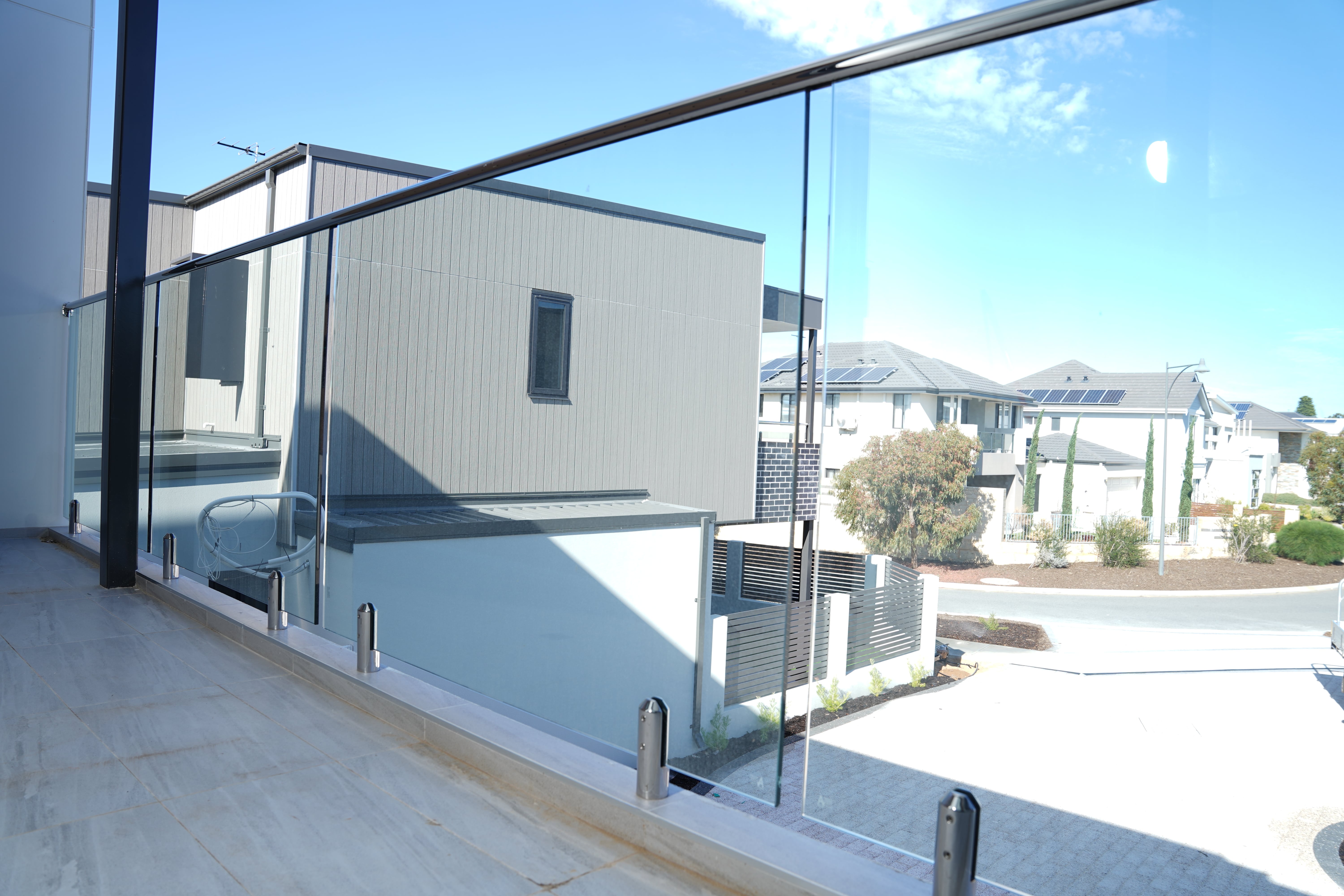 This installation at Anthus showcases a sleek glass balustrade system using top-fixed polished stainless steel spigots. Positioned on a balcony/deck, the design emphasizes minimalism and clear, unobstructed views, with no handrail to maintain a clean architectural finish. Ideal for modern residential facades prioritizing style and visibility.