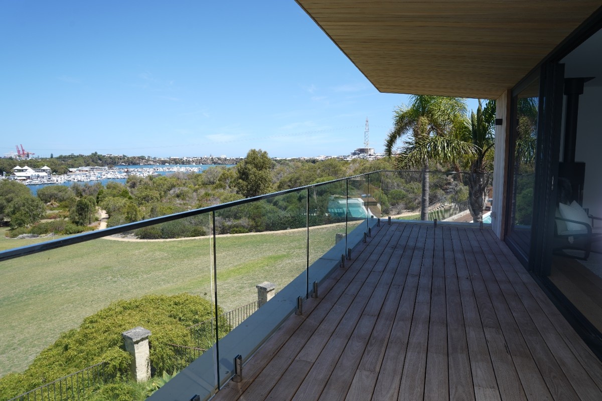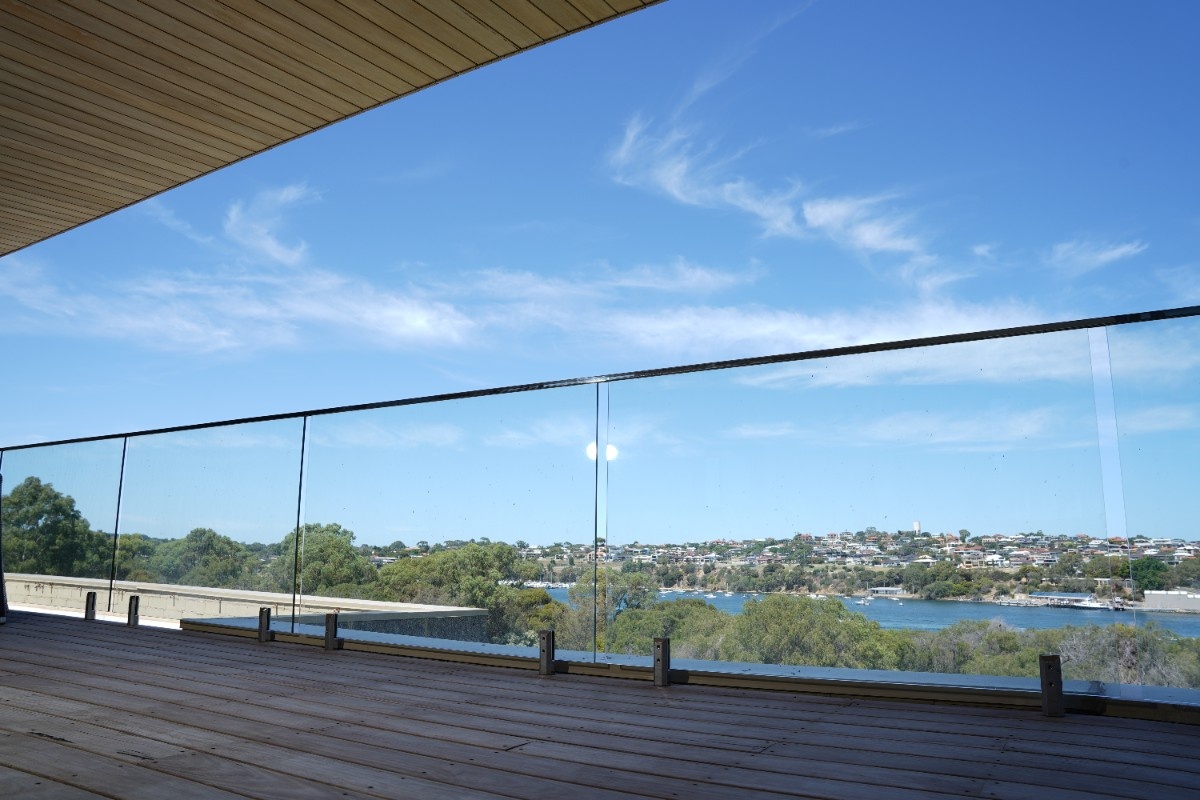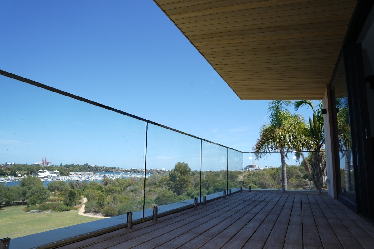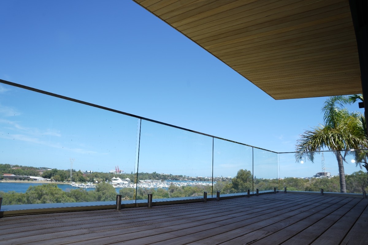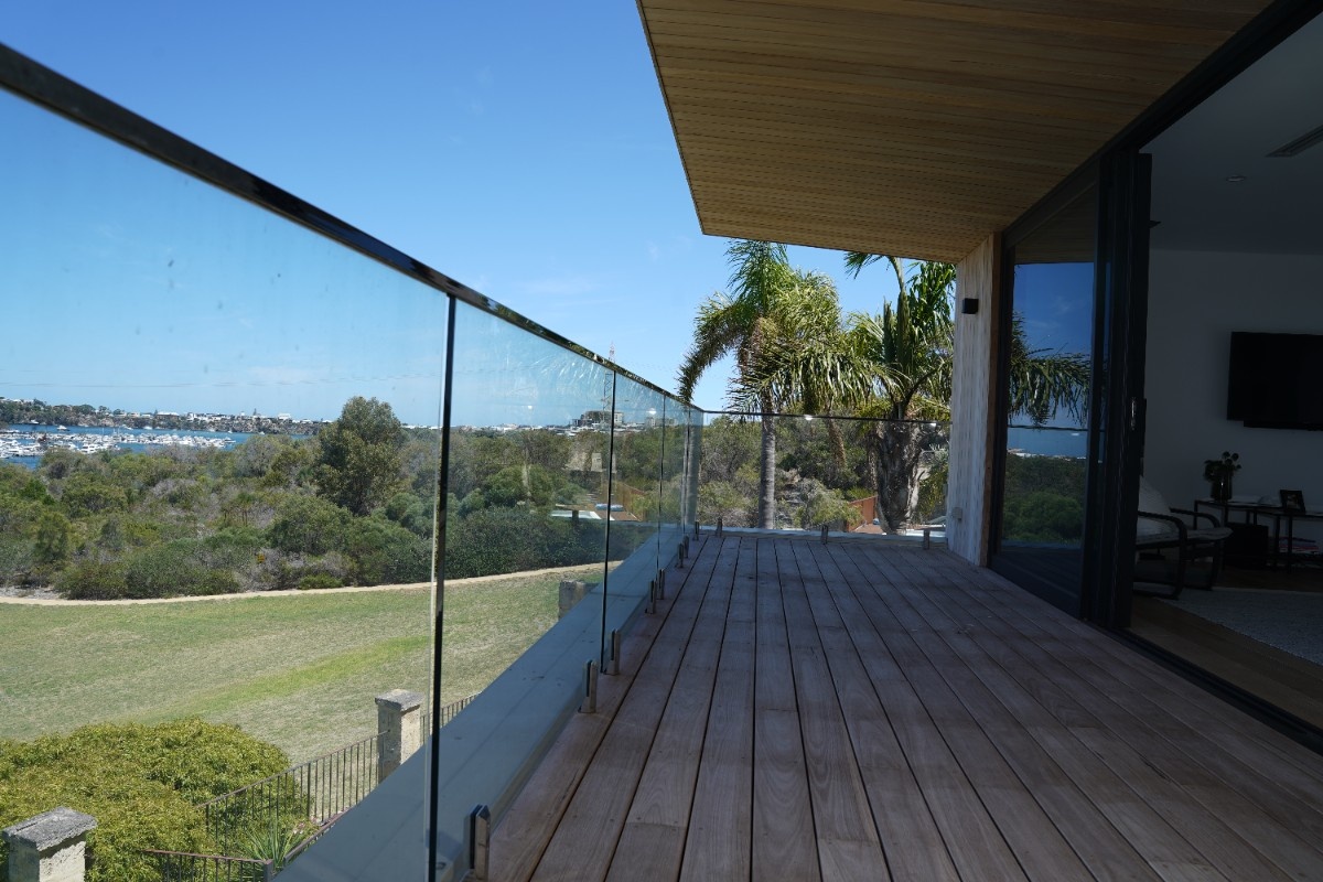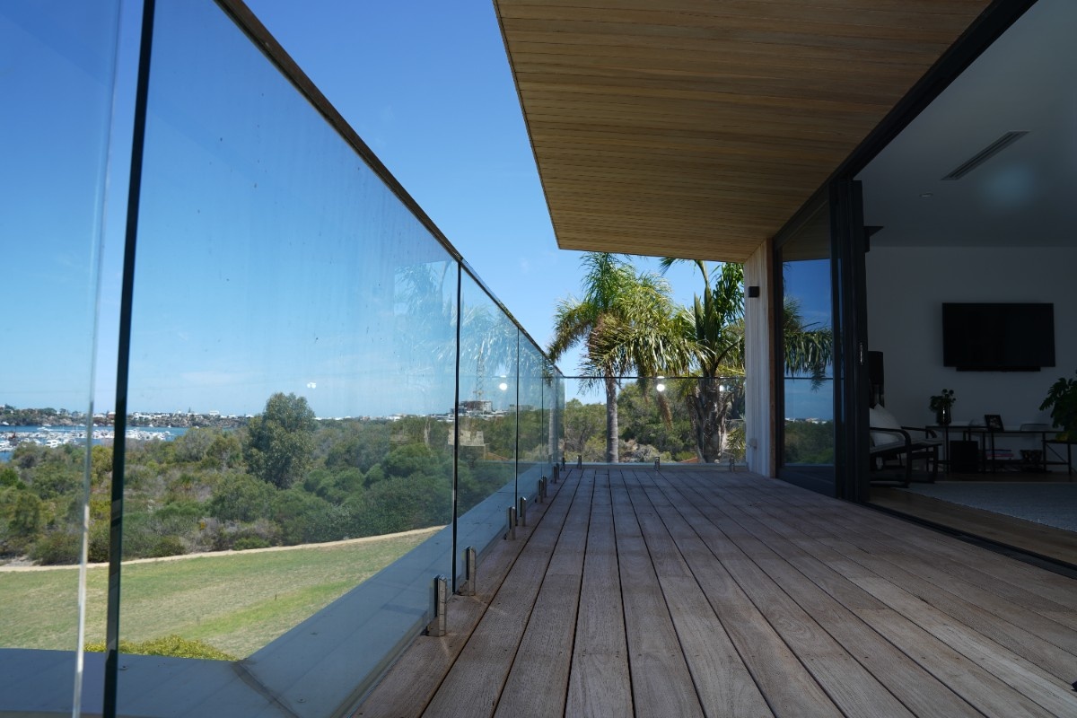 A stunning elevated deck installation at Ashford featuring top-fixed glass balustrades for maximum visibility of the surrounding waterfront and greenery. The system uses polished stainless steel spigots without a handrail, preserving a clean, uninterrupted view—perfect for outdoor entertainment areas where scenery is the highlight.