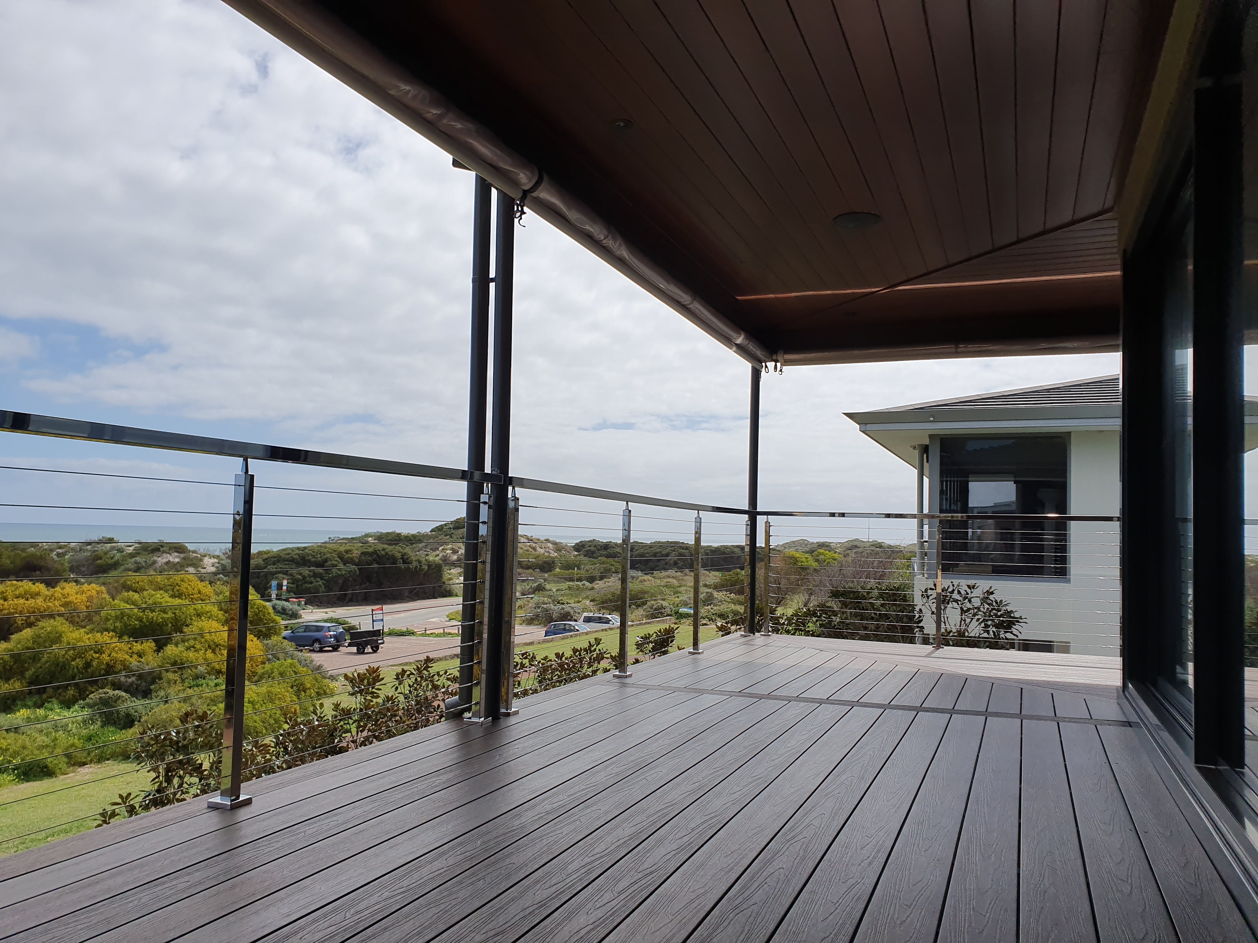 Beautiful coastal balcony with stainless steel handrails and wire balustrade, offering safety while preserving the panoramic ocean view and enhancing the modern outdoor living experience.
