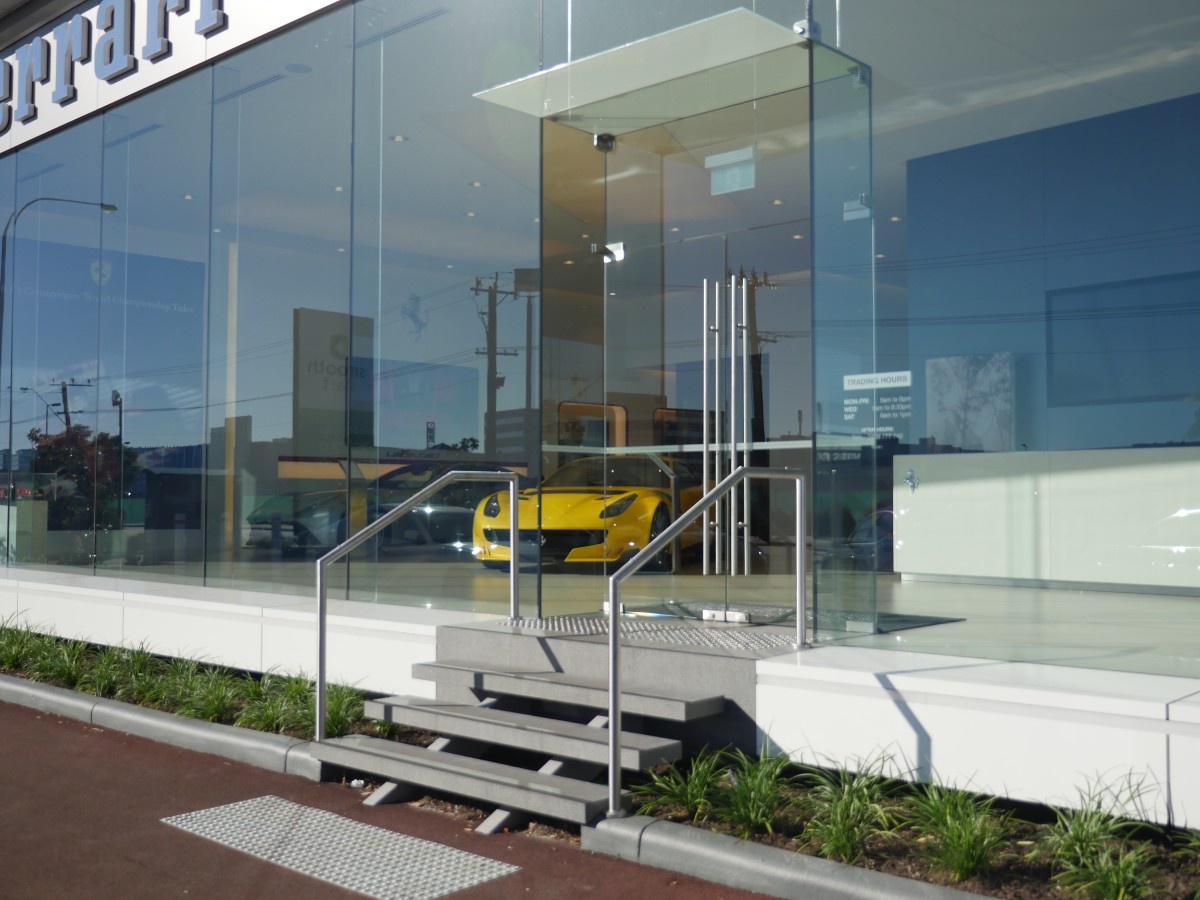 A sleek Ø38.2mm brushed stainless steel commercial handrail installed on straight stone steps, enhancing safety and accessibility while complementing the modern aesthetic of the showroom entrance.