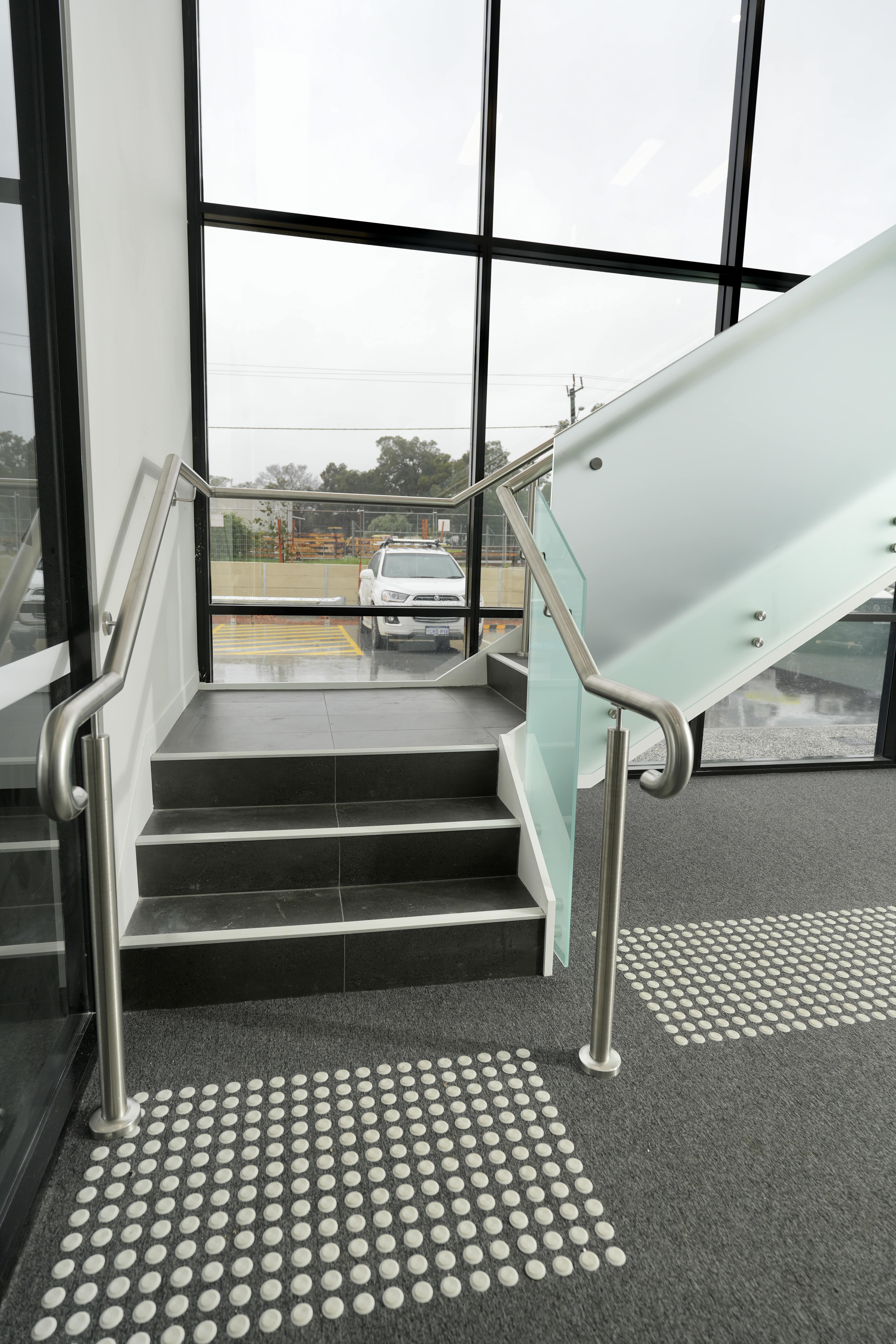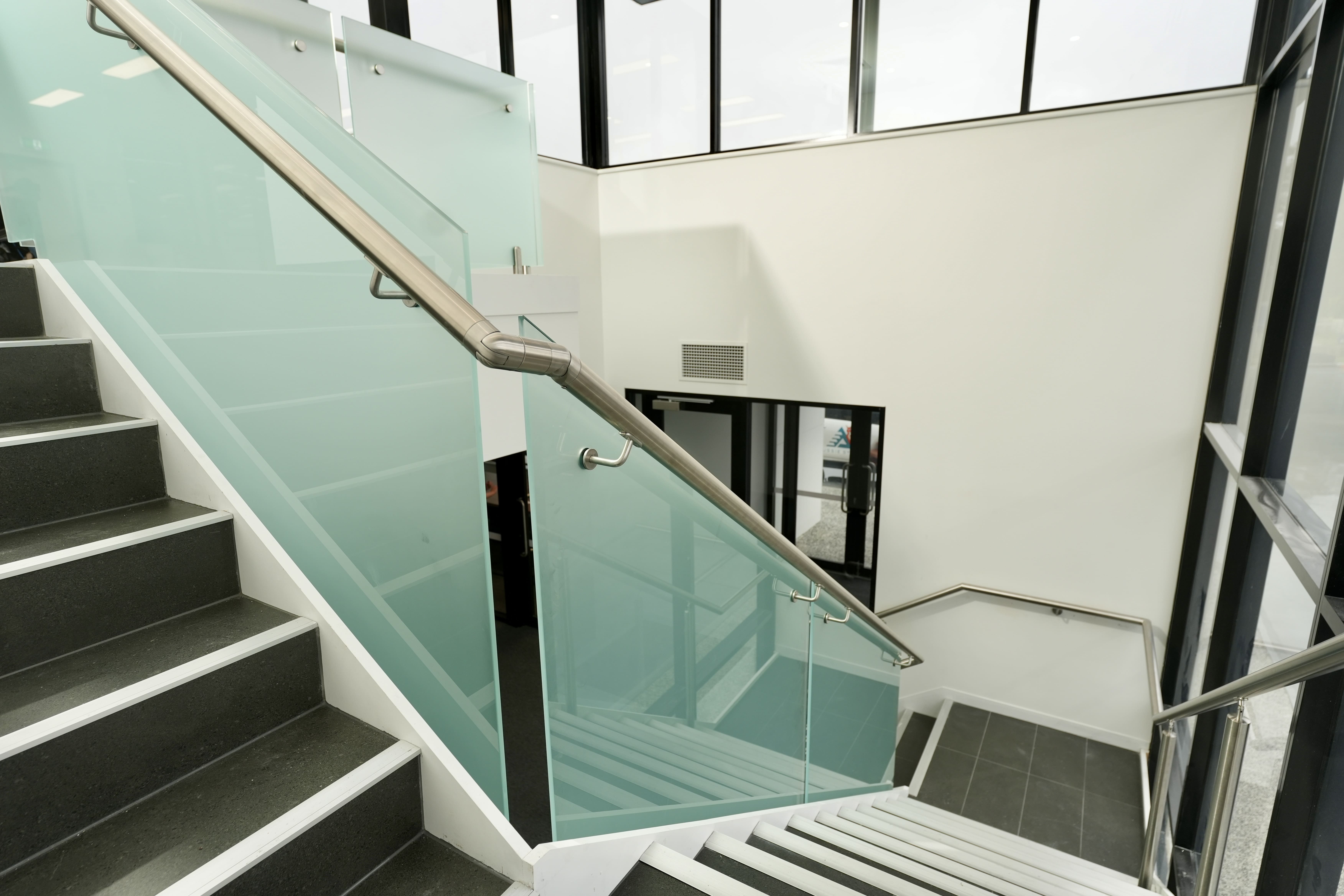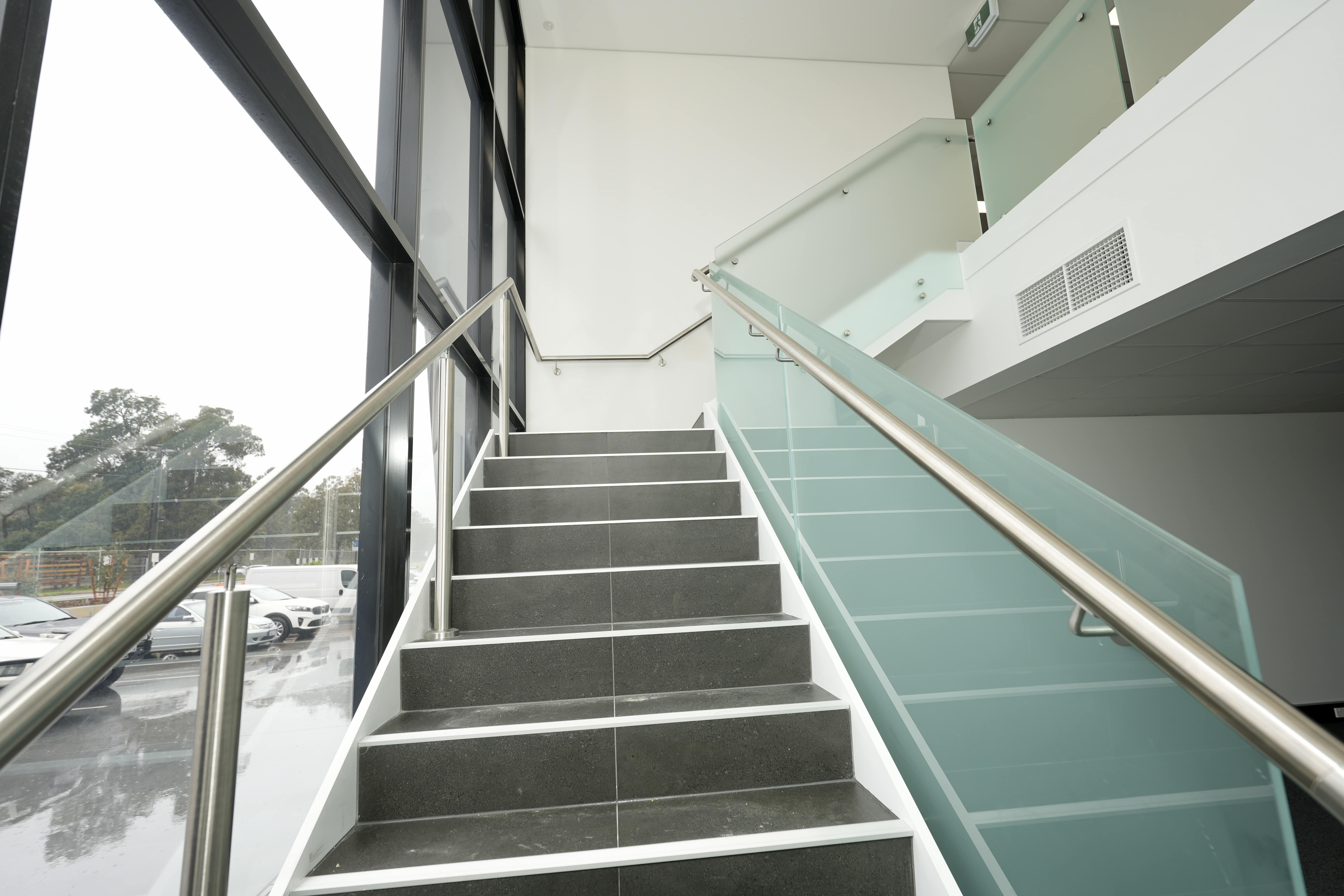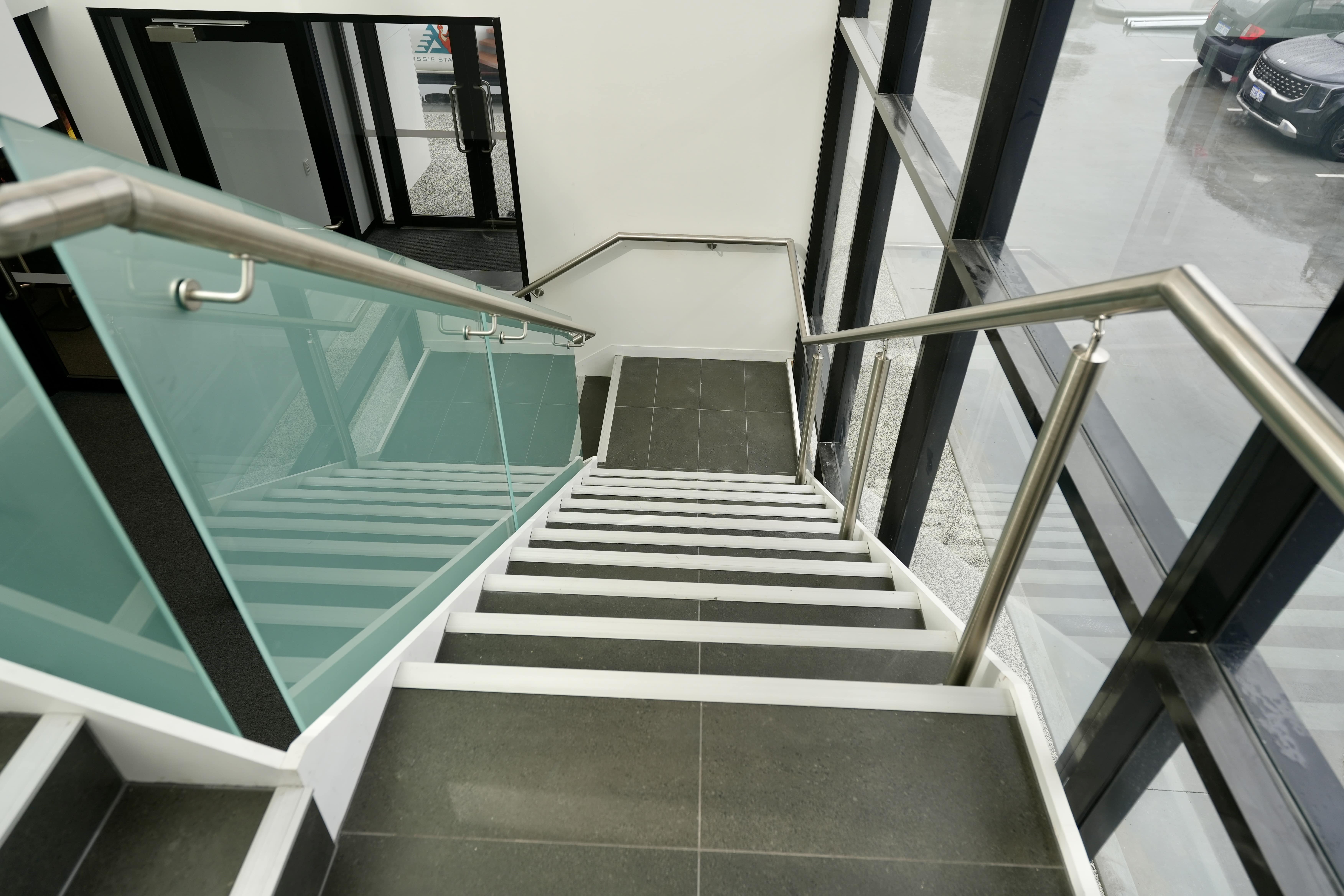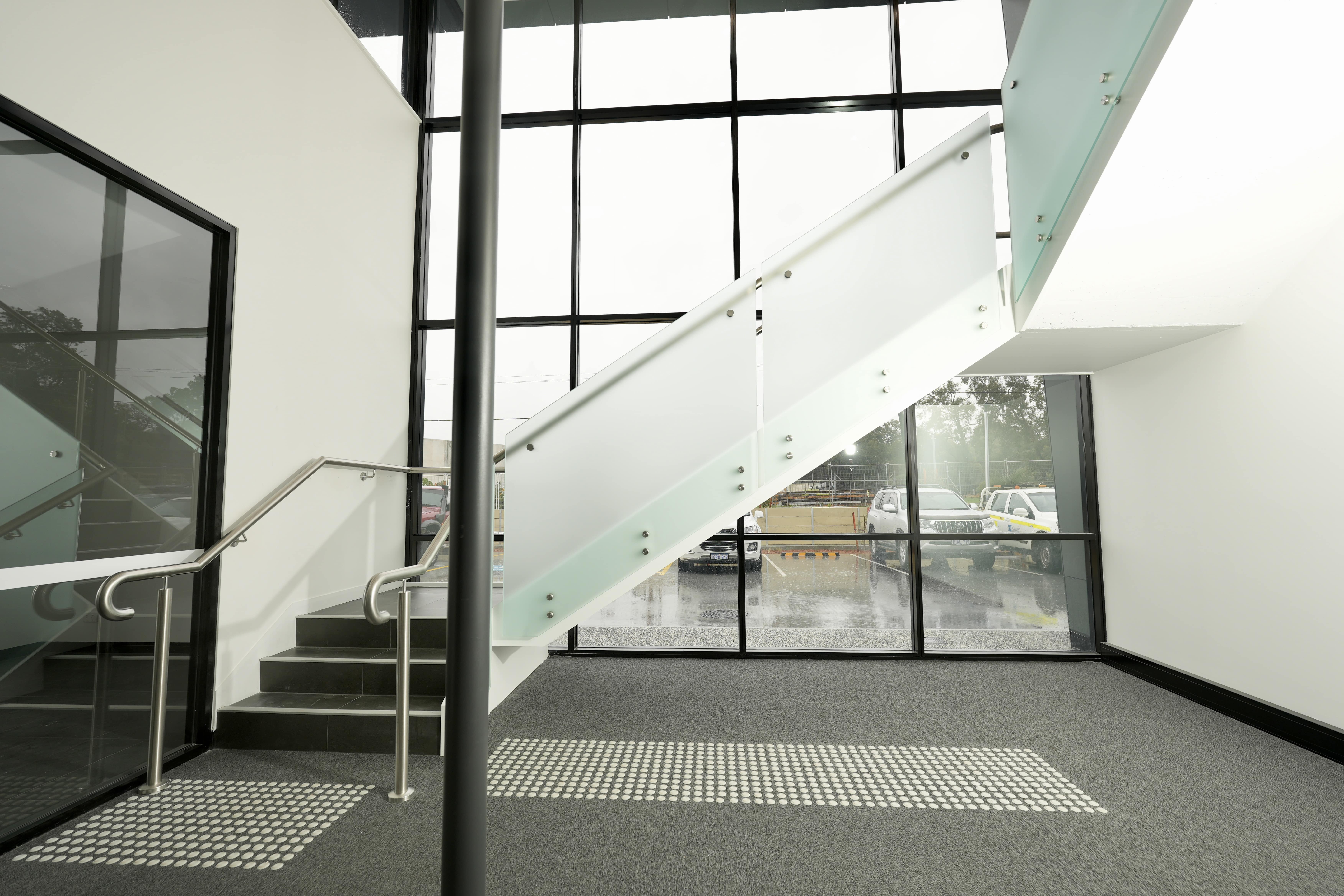 Modern commercial stair installation featuring glass side-fixed balustrades and brushed stainless steel handrails. The stair design combines both safety and aesthetic appeal. Ideal for a sleek and functional entry in a business or public facility in Maddington.