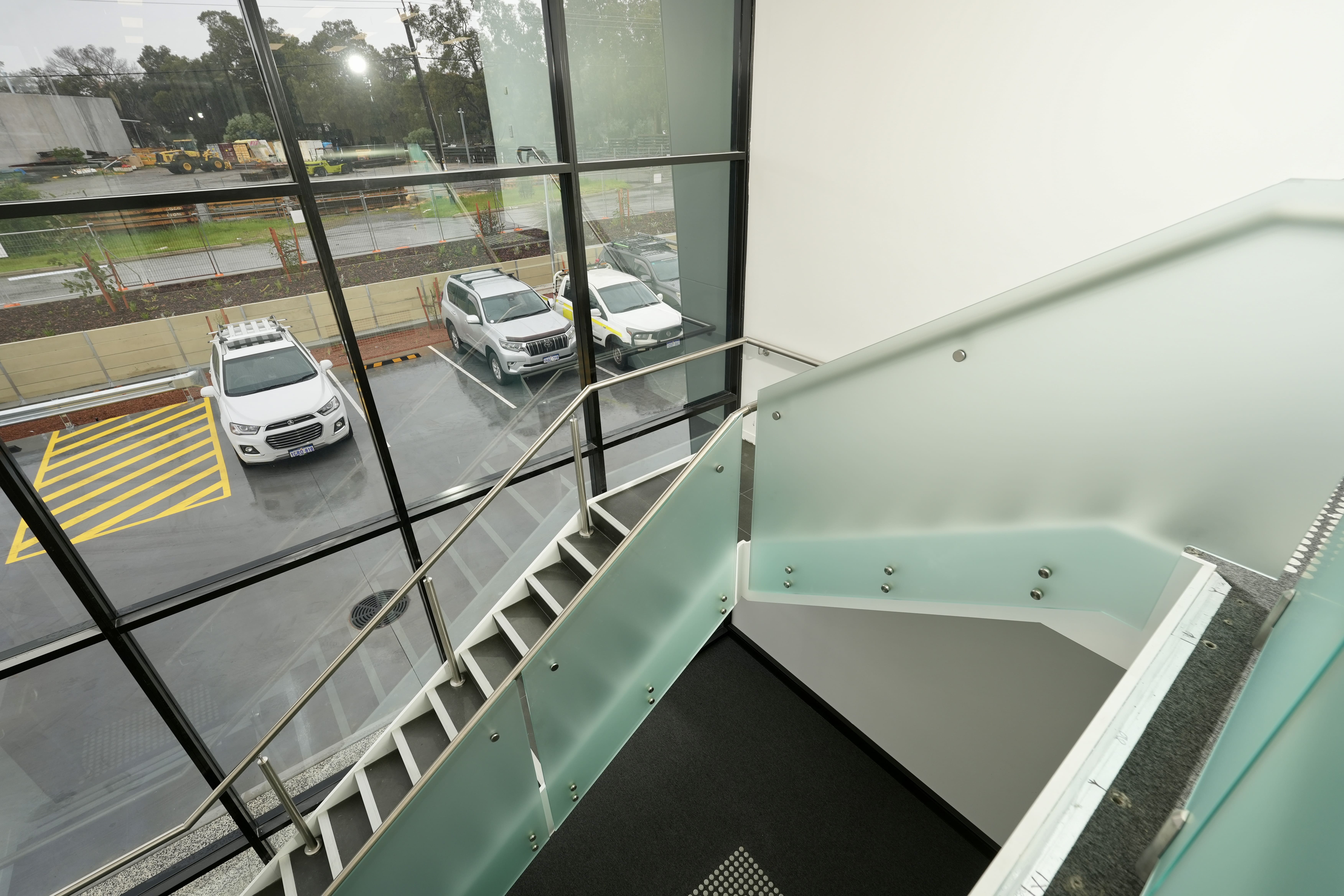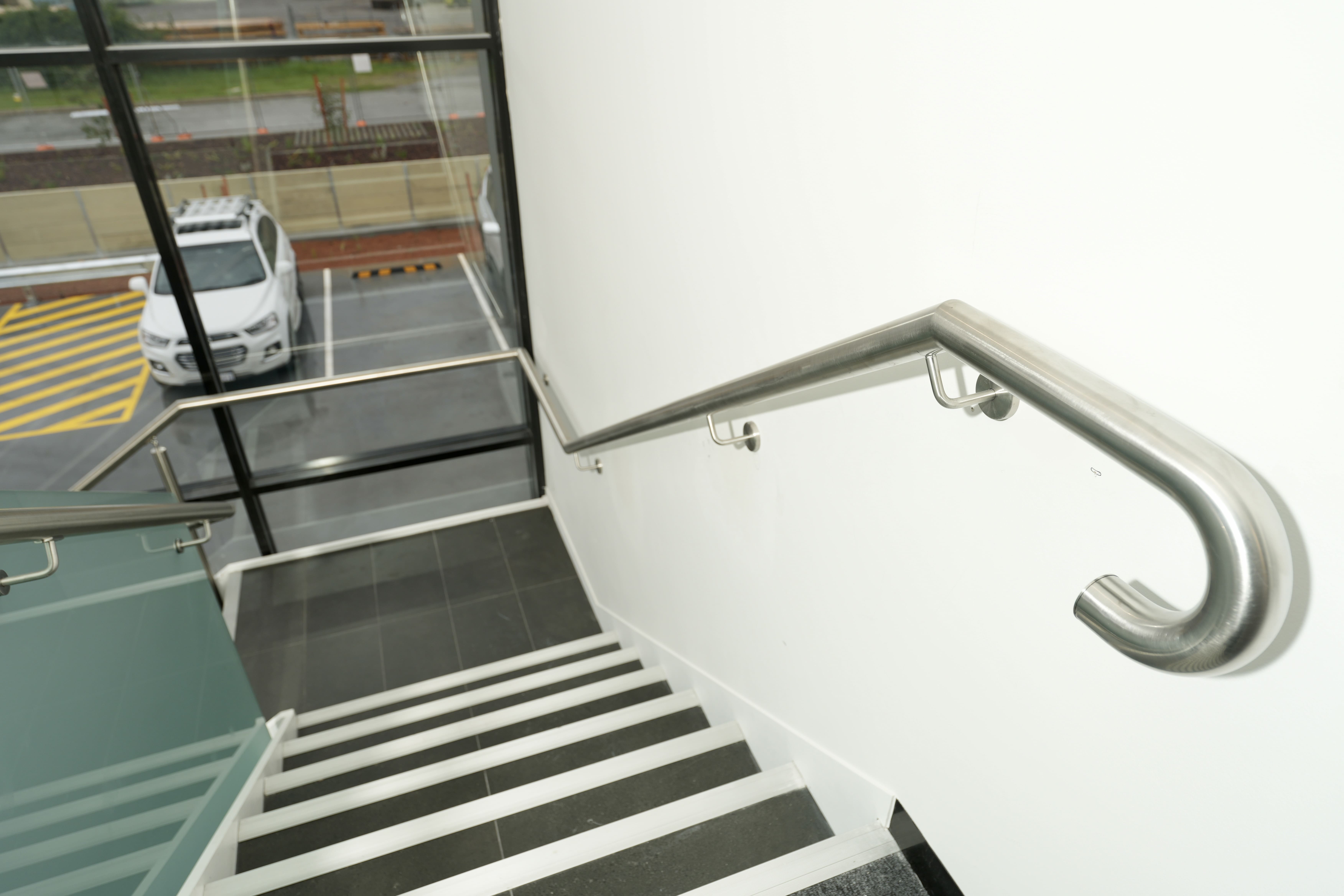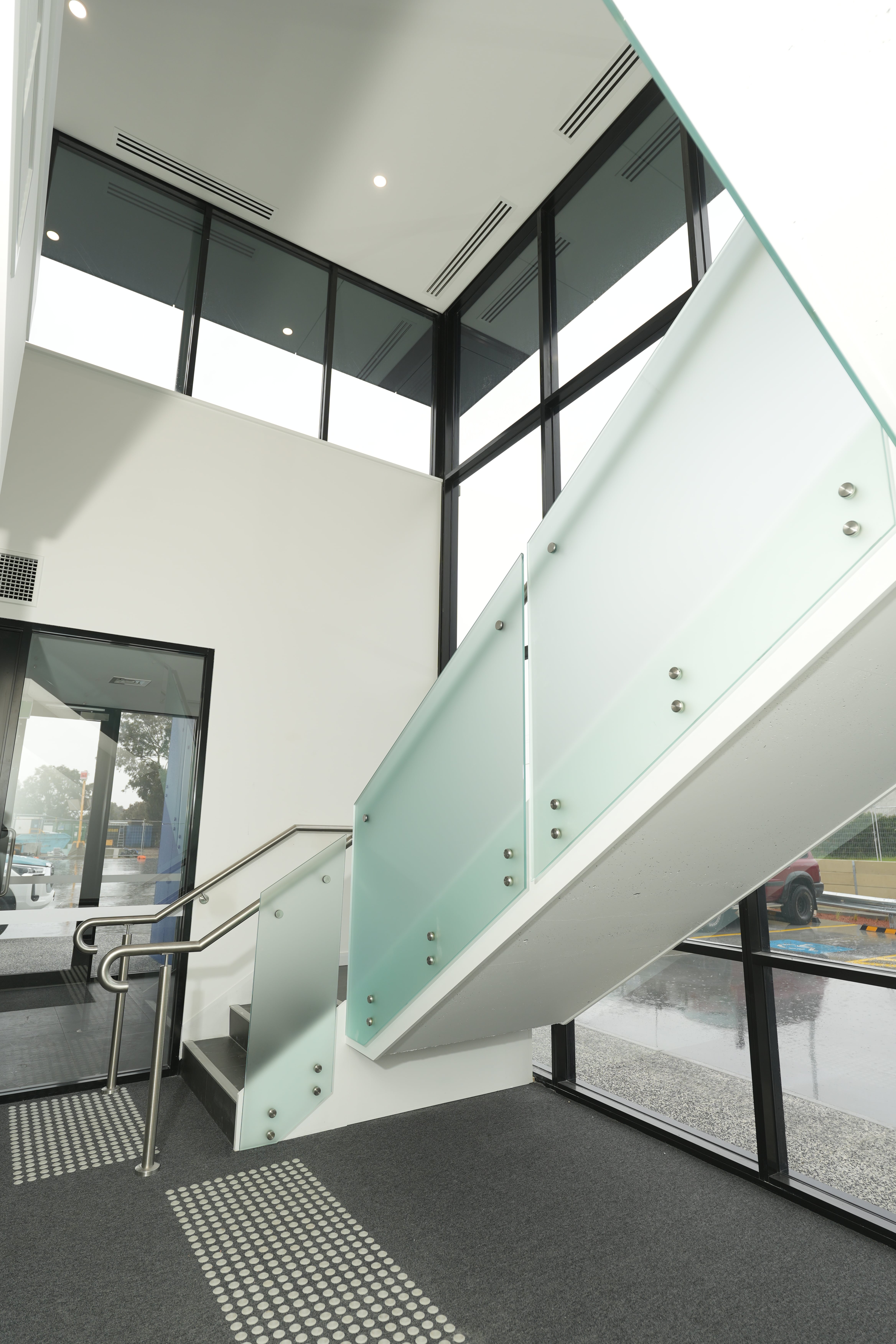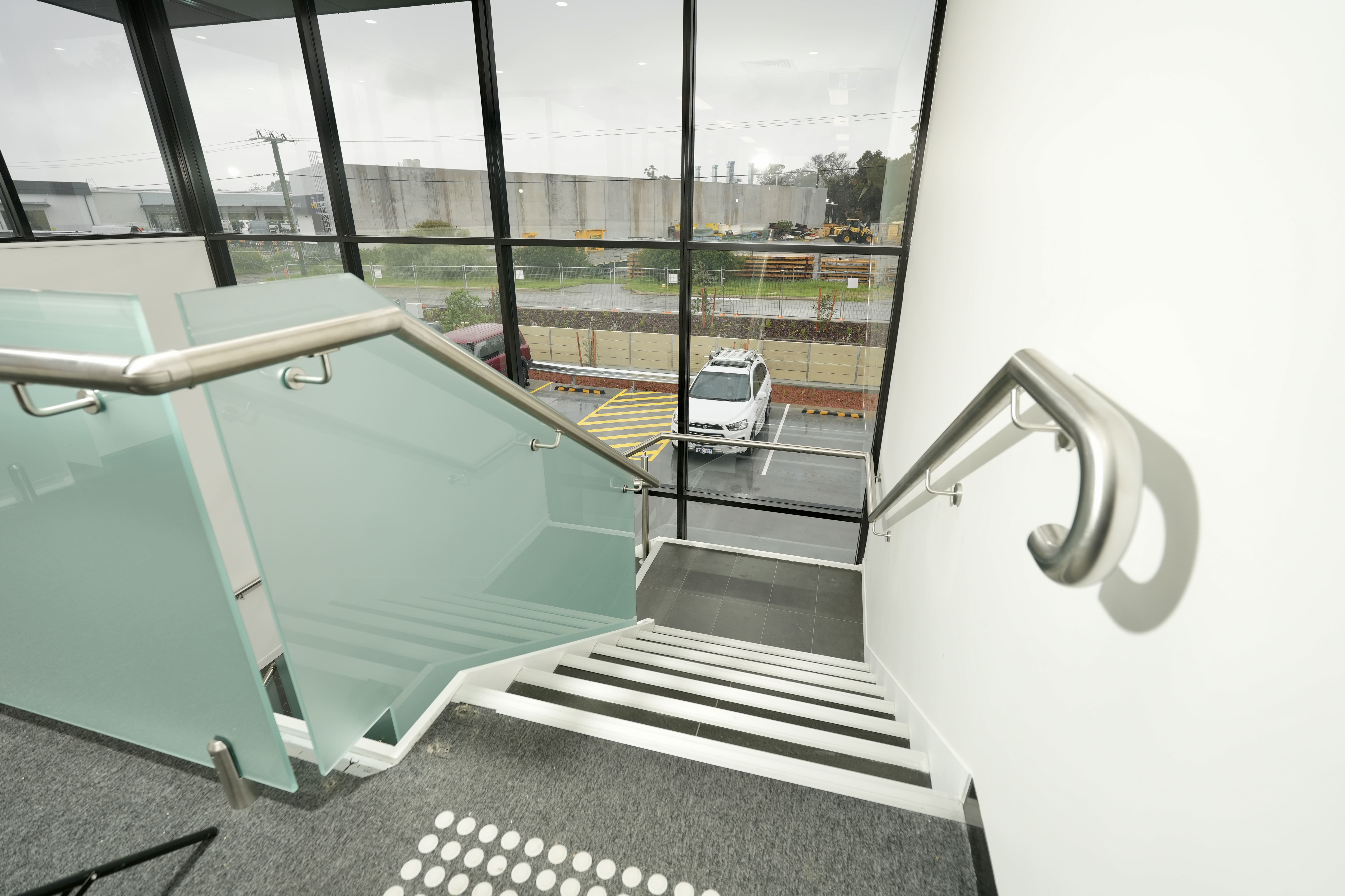 Modern commercial stair installation featuring glass side-fixed balustrades and brushed stainless steel handrails. The stair design combines both safety and aesthetic appeal. Ideal for a sleek and functional entry in a business or public facility in Maddington.