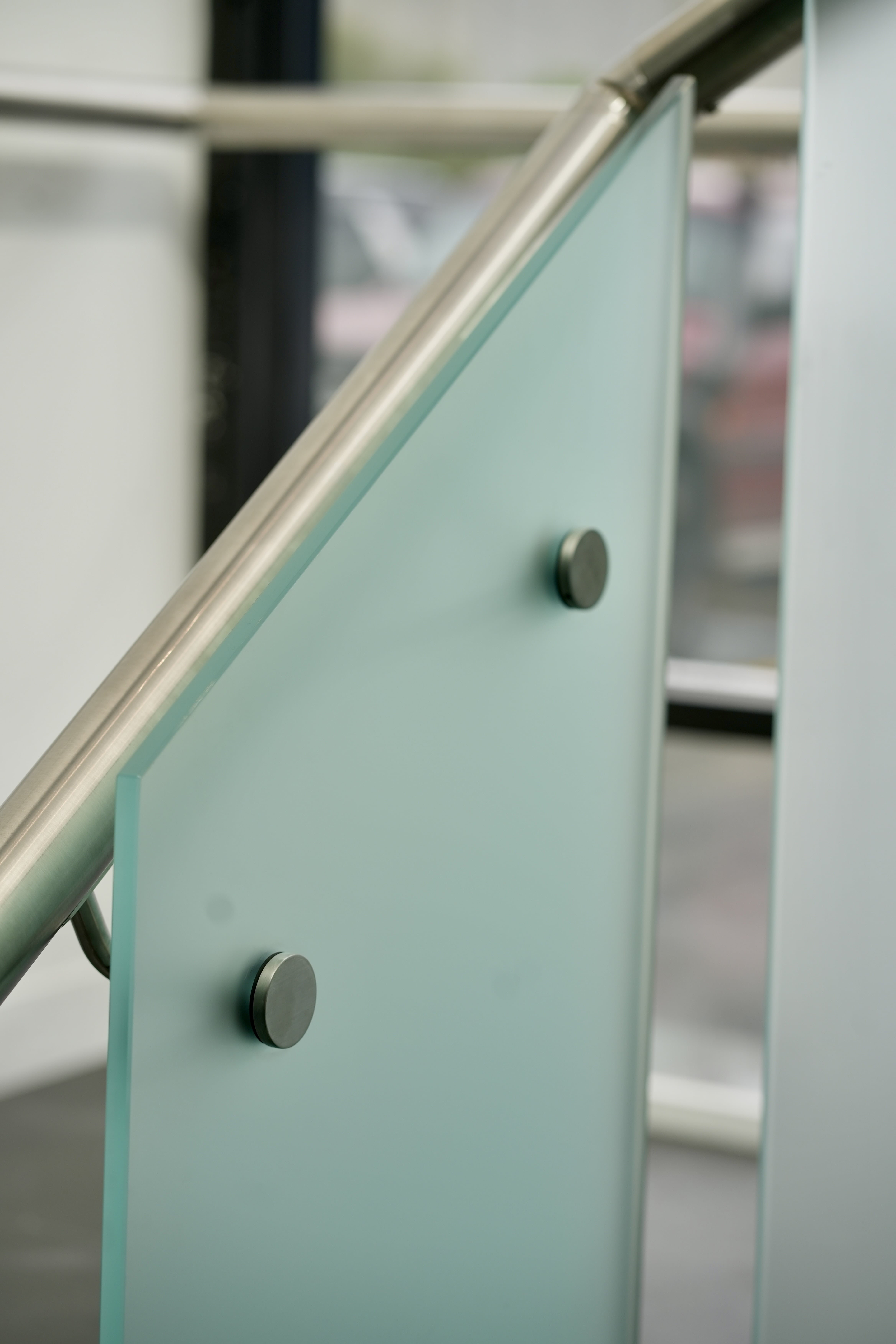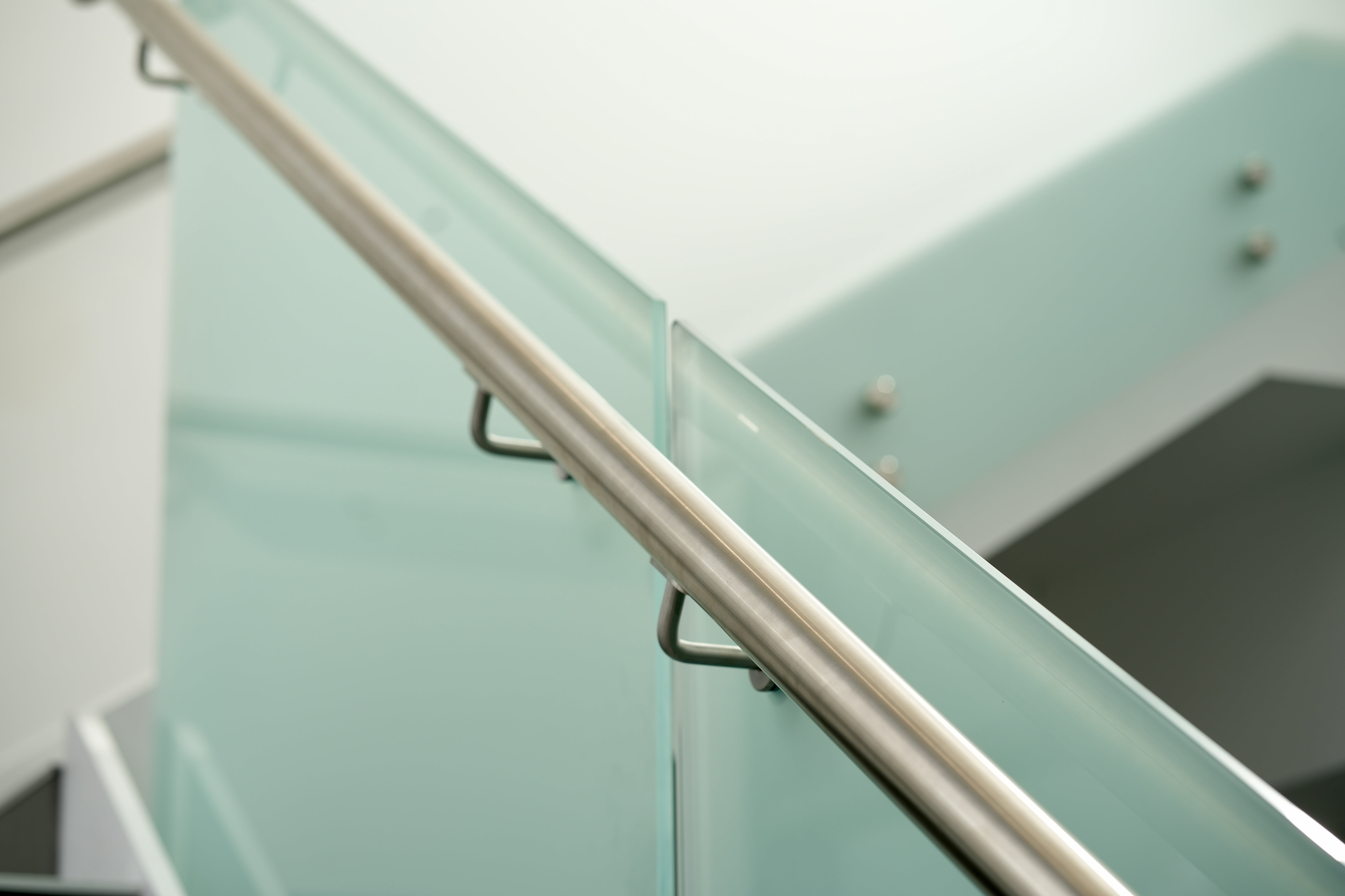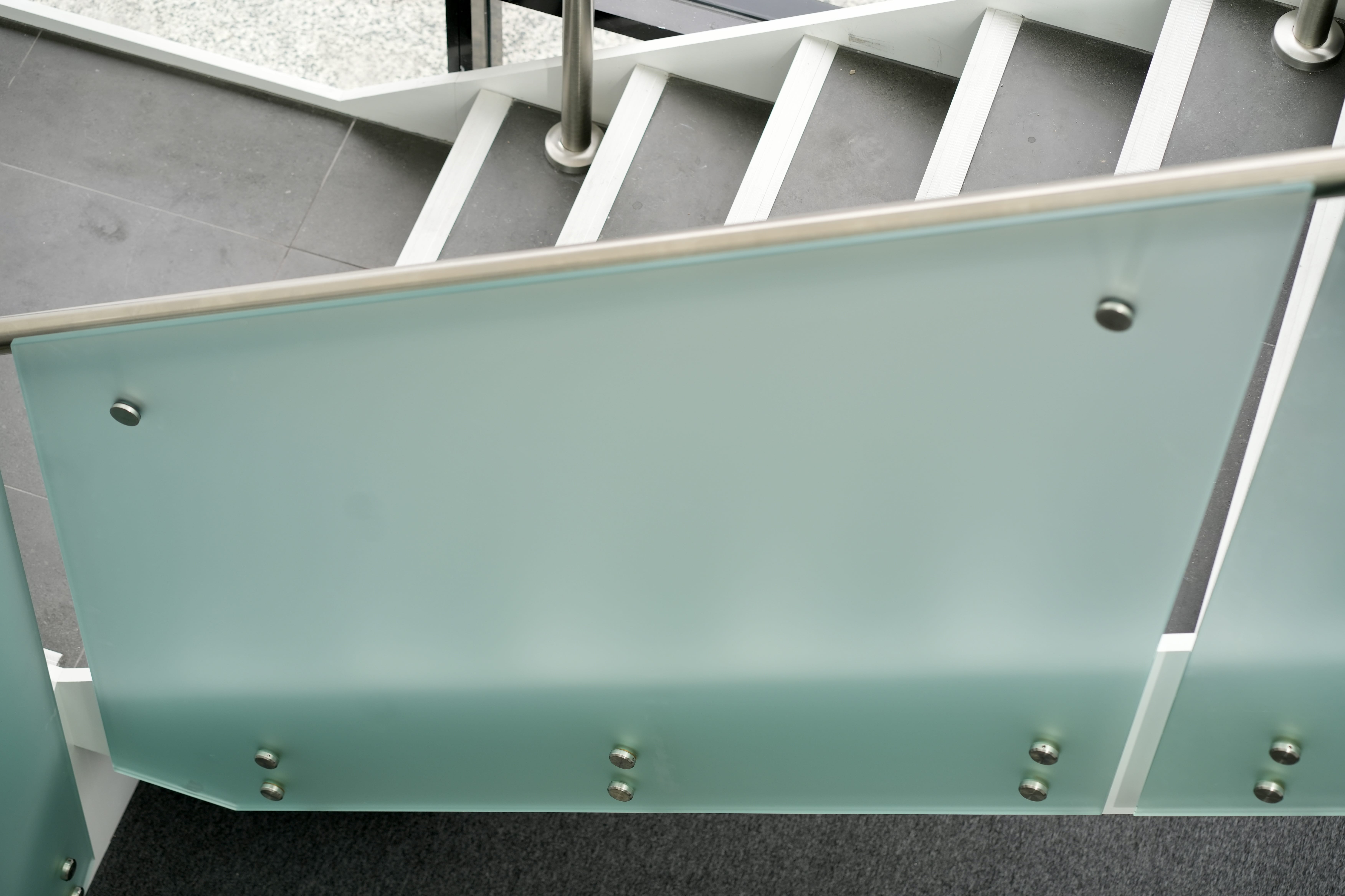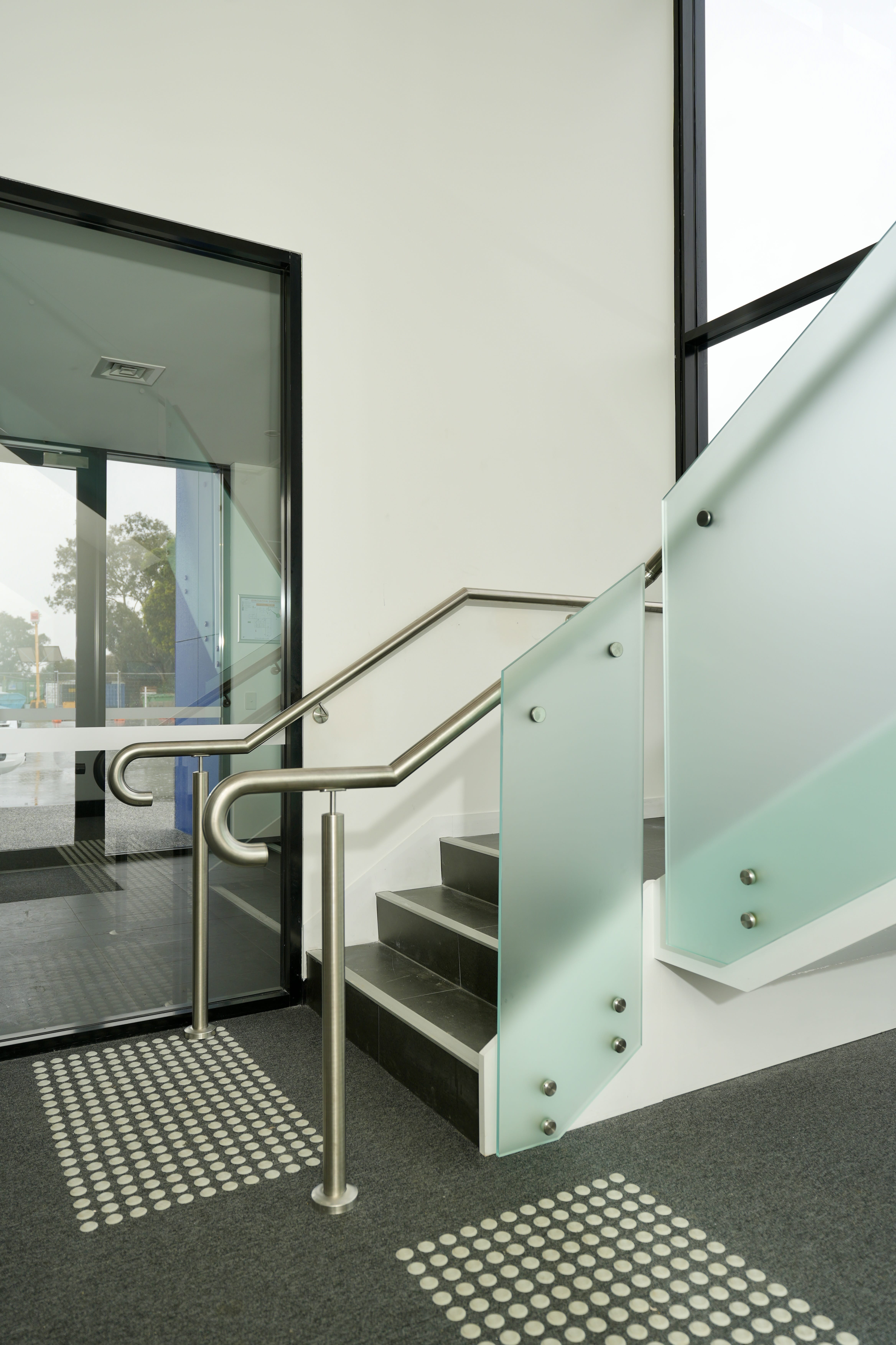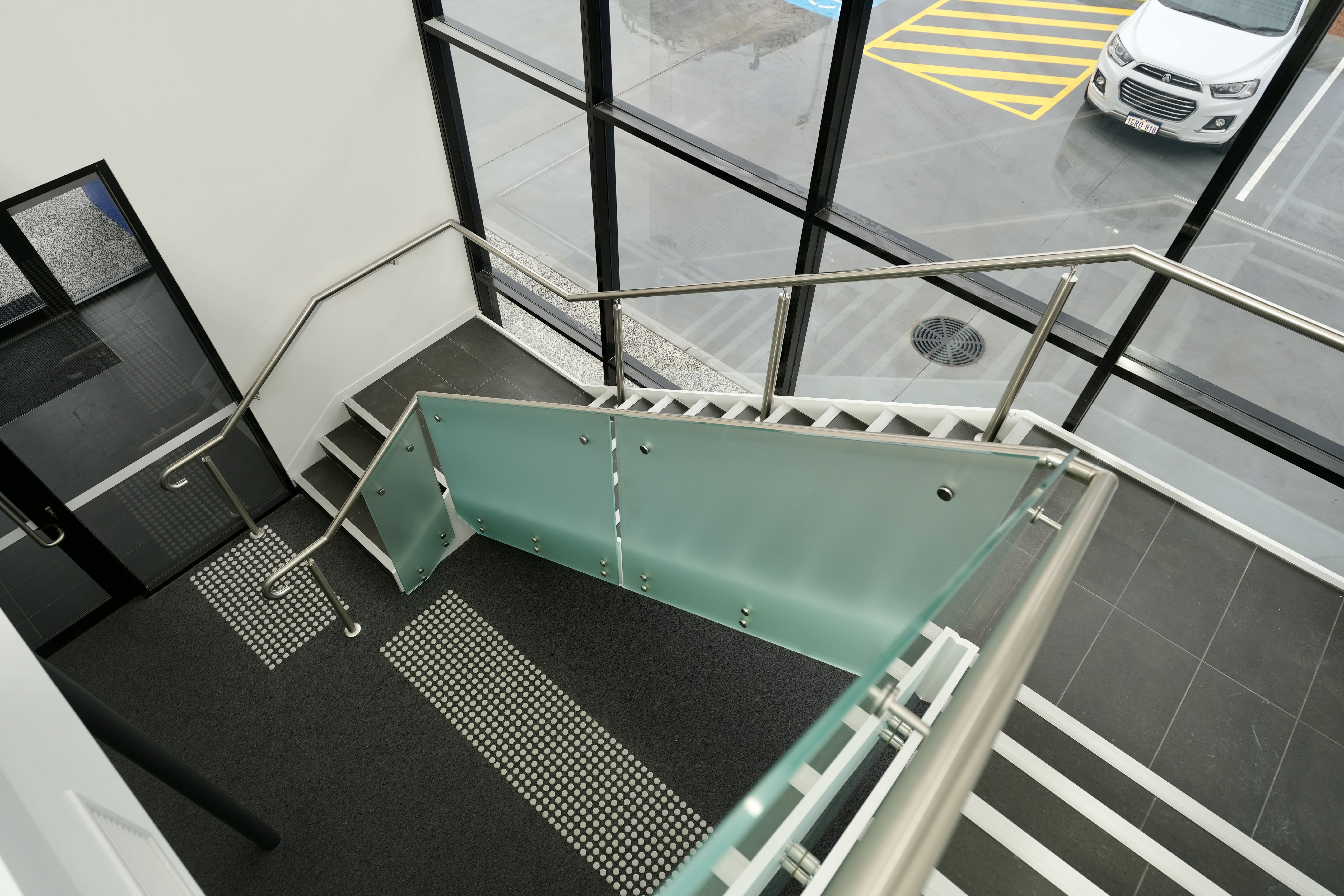 Modern commercial stair installation featuring glass side-fixed balustrades and brushed stainless steel handrails. The stair design combines both safety and aesthetic appeal. Ideal for a sleek and functional entry in a business or public facility in Maddington.