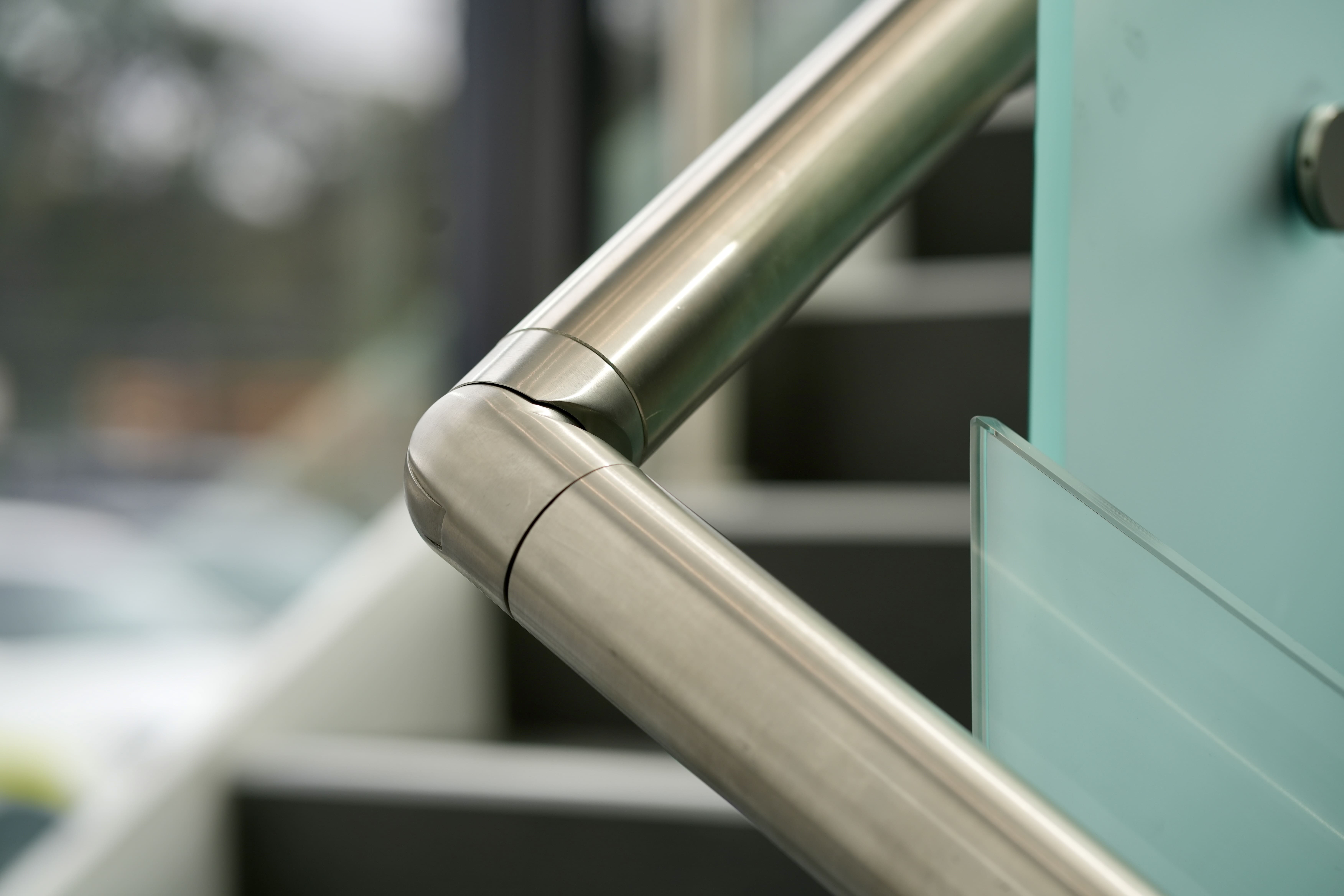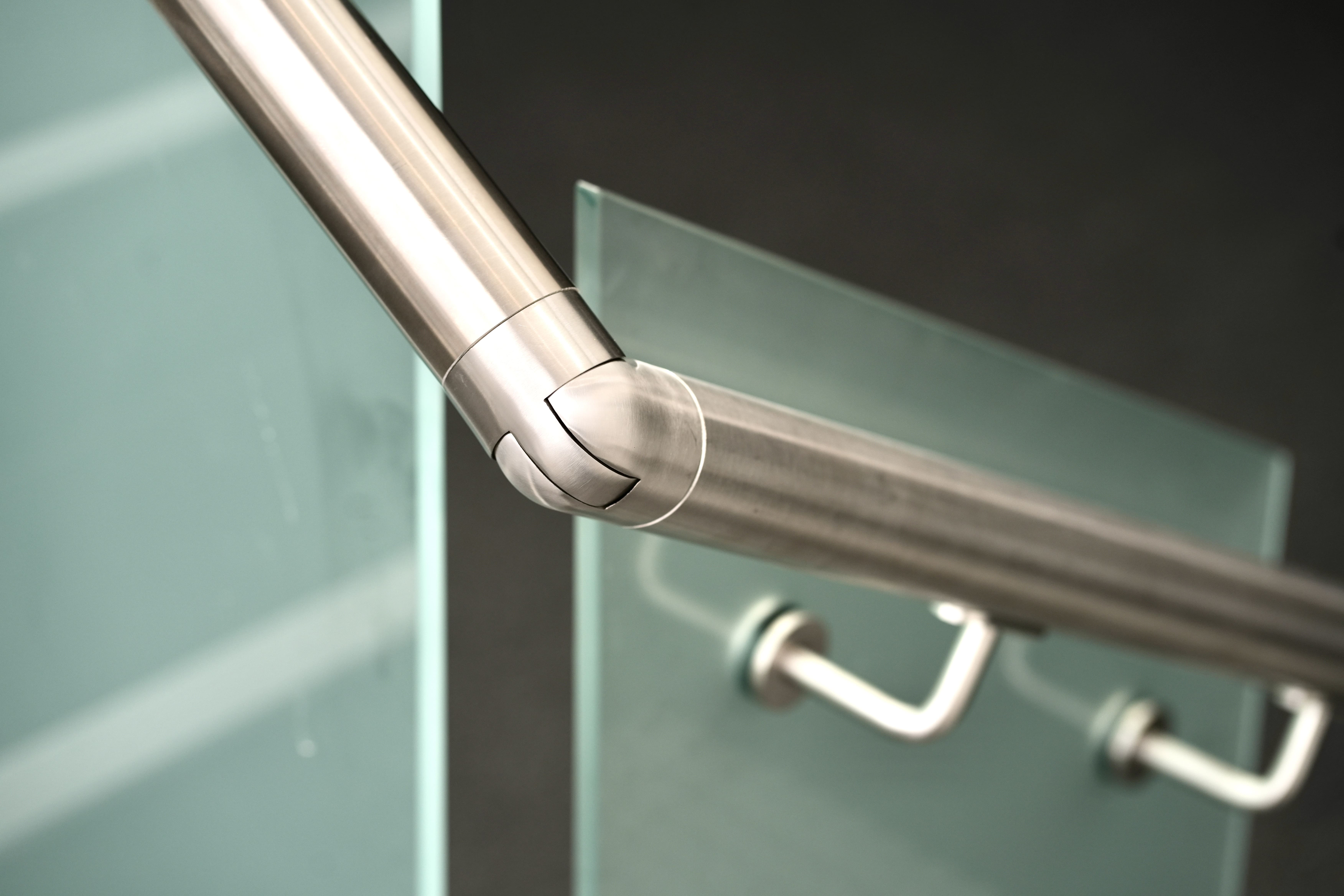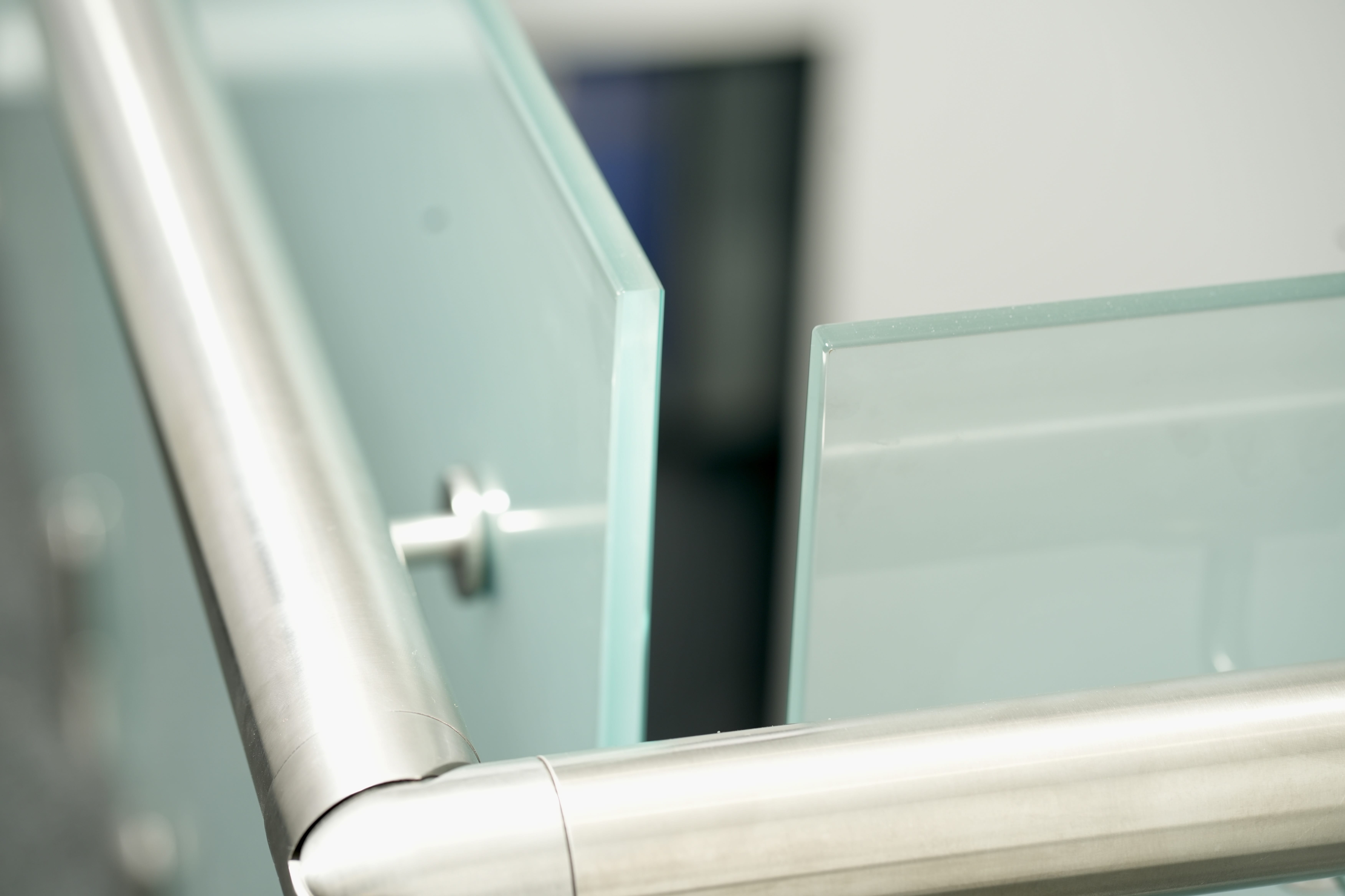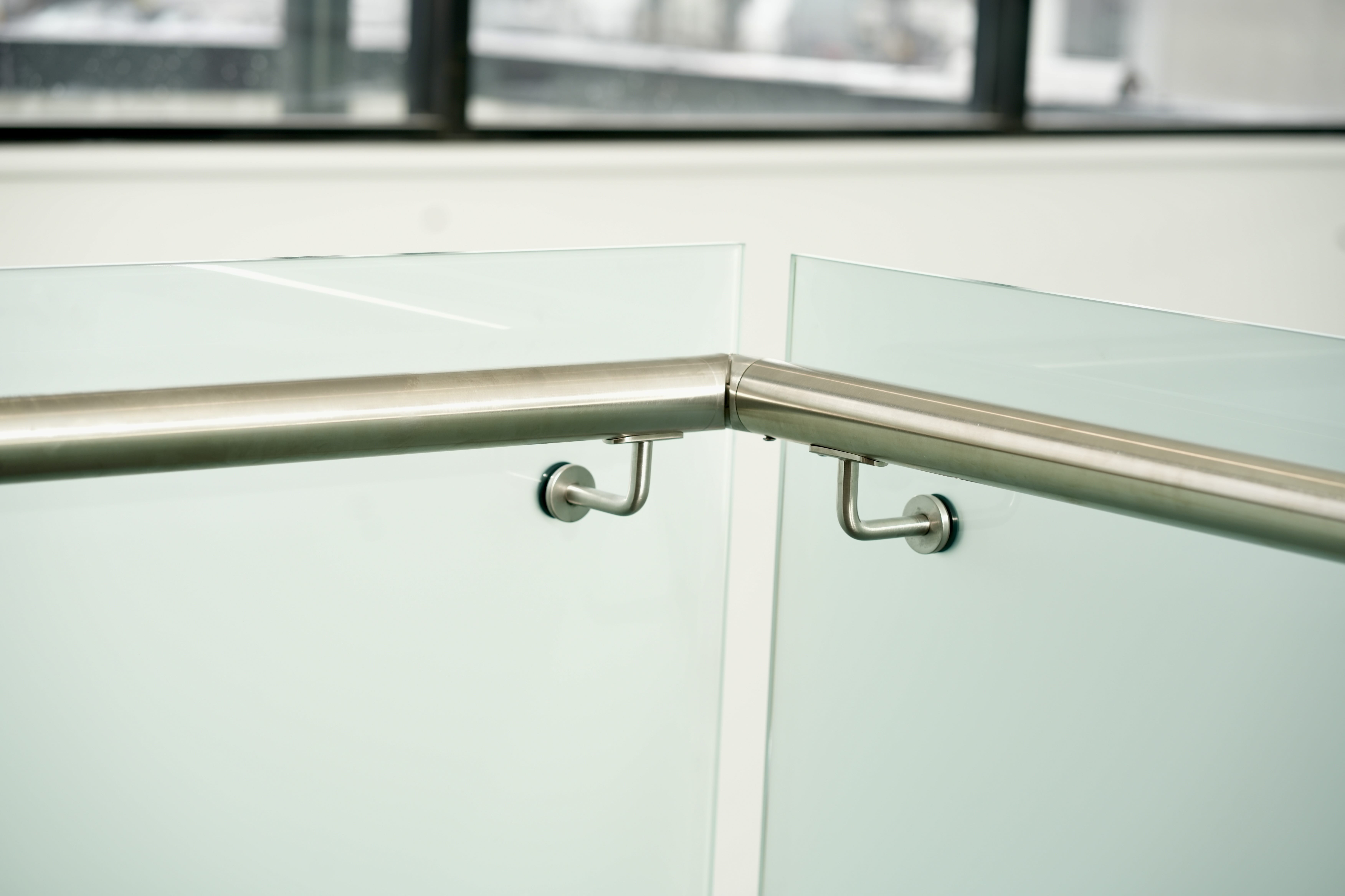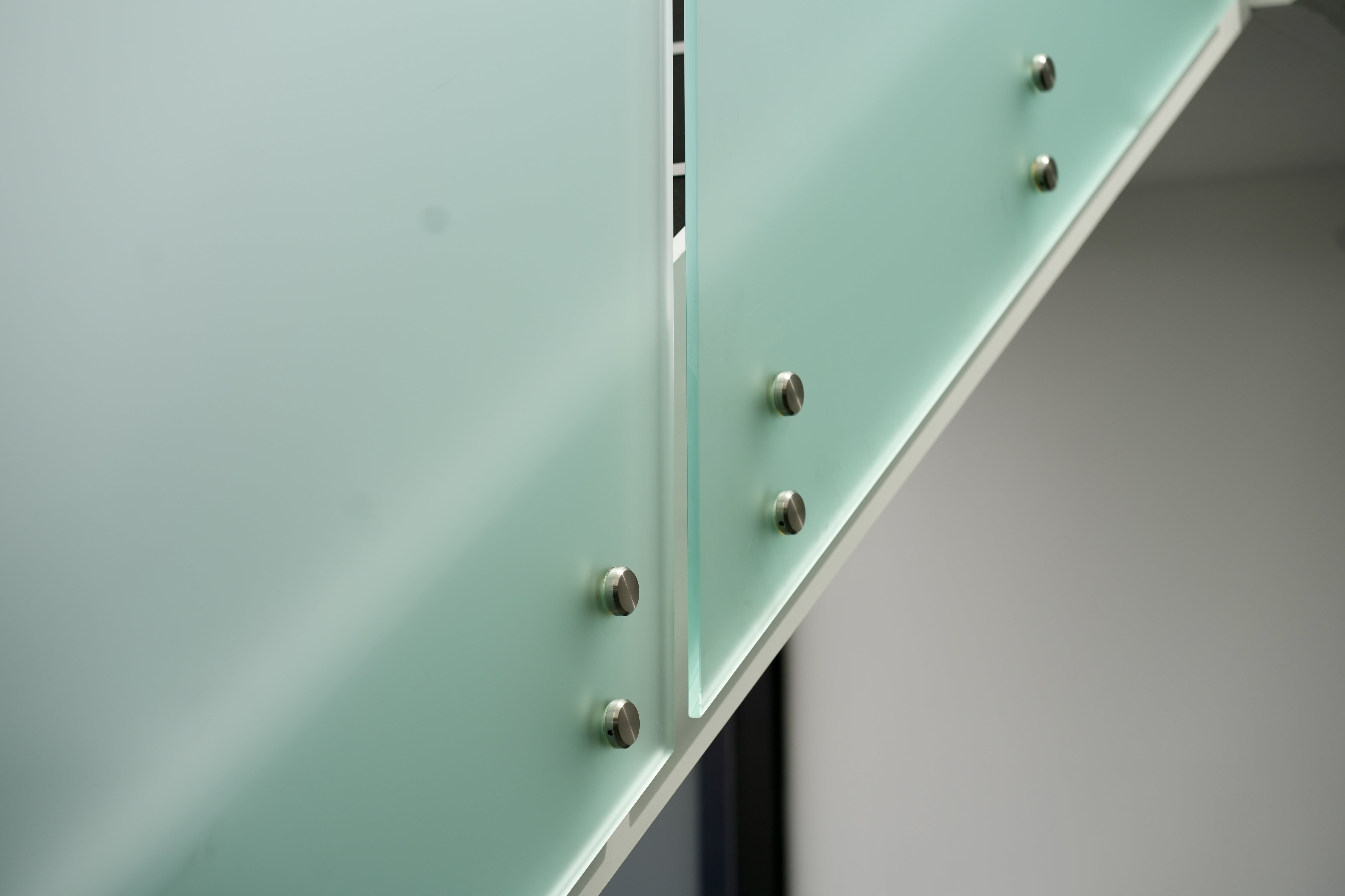 Modern commercial stair installation featuring glass side-fixed balustrades and brushed stainless steel handrails. The stair design combines both safety and aesthetic appeal. Ideal for a sleek and functional entry in a business or public facility in Maddington.