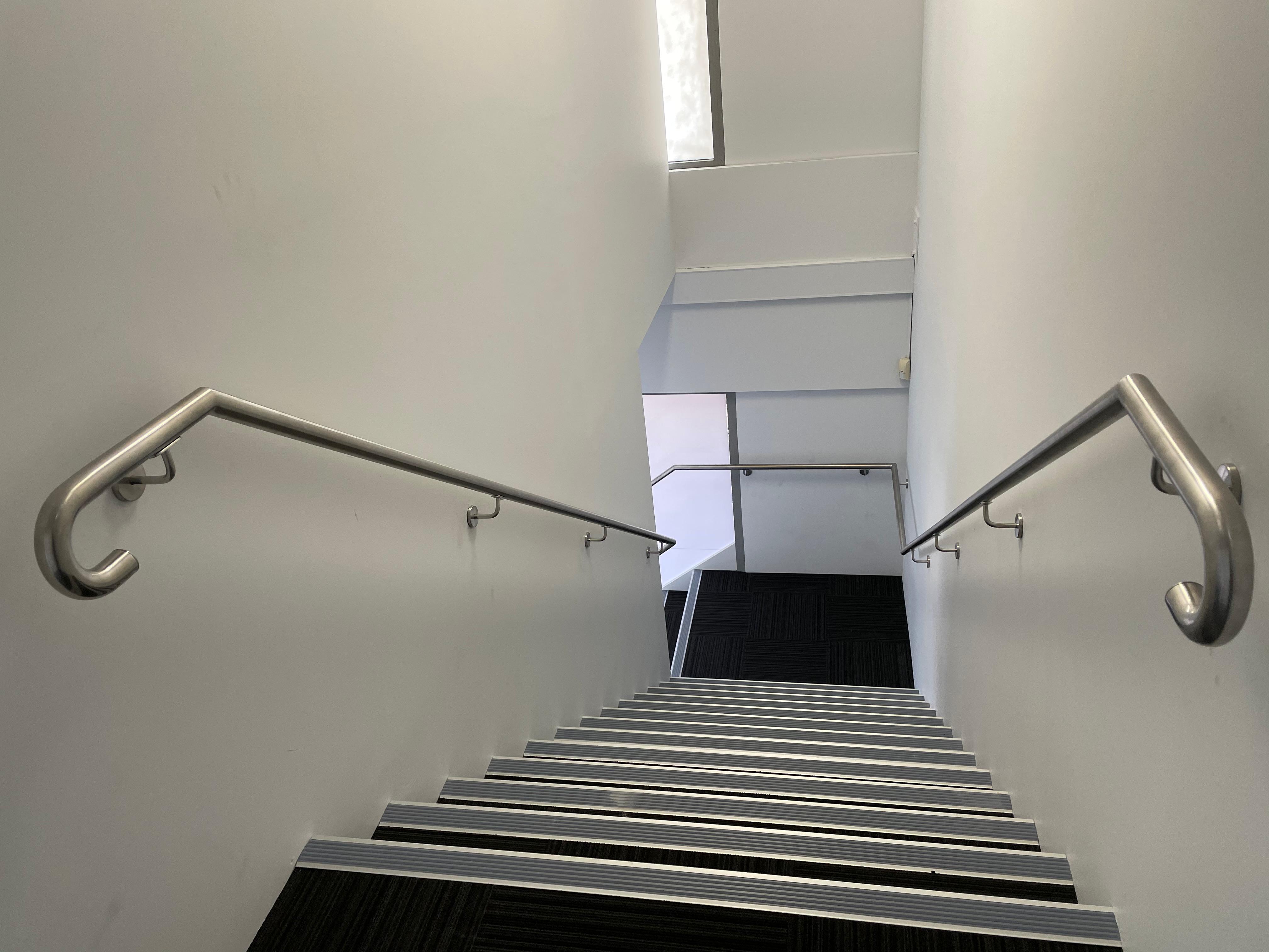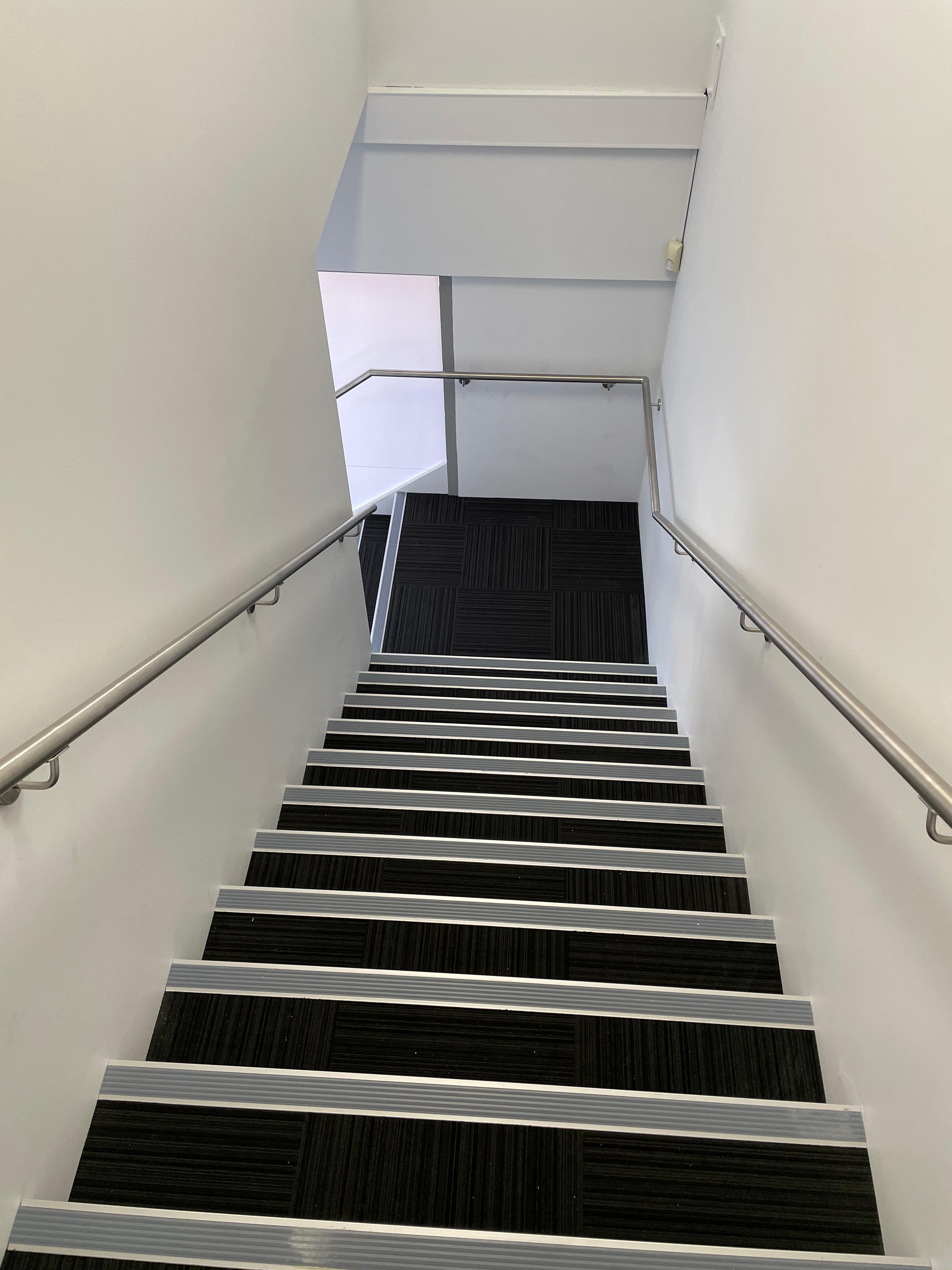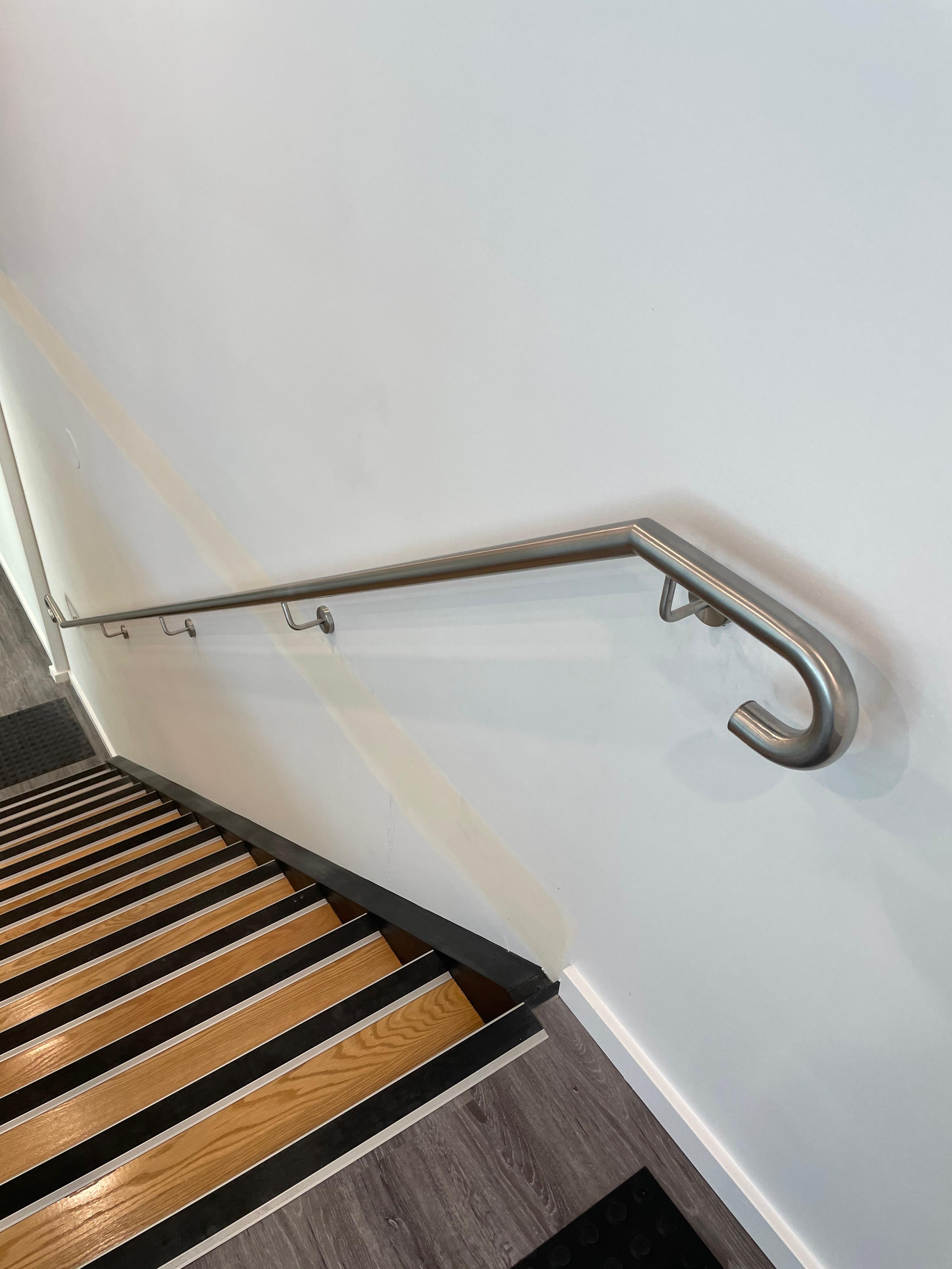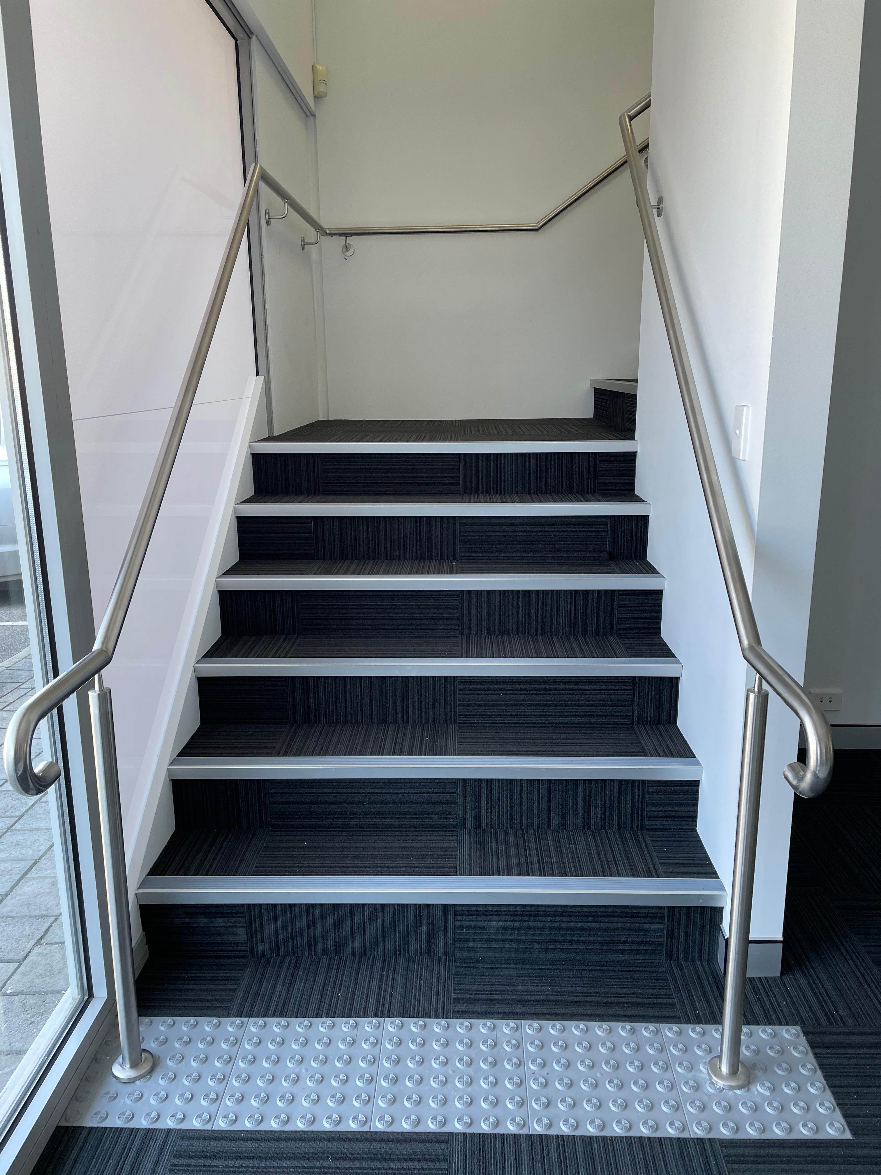 A commercial brushed stainless steel handrail installed on both sides of a double stringer, straight staircase with carpeted treads. The handrails feature rounded ends and sturdy mounting for safety and accessibility in a commercial or office environment. The design is clean, functional, and compliant with commercial safety standards.