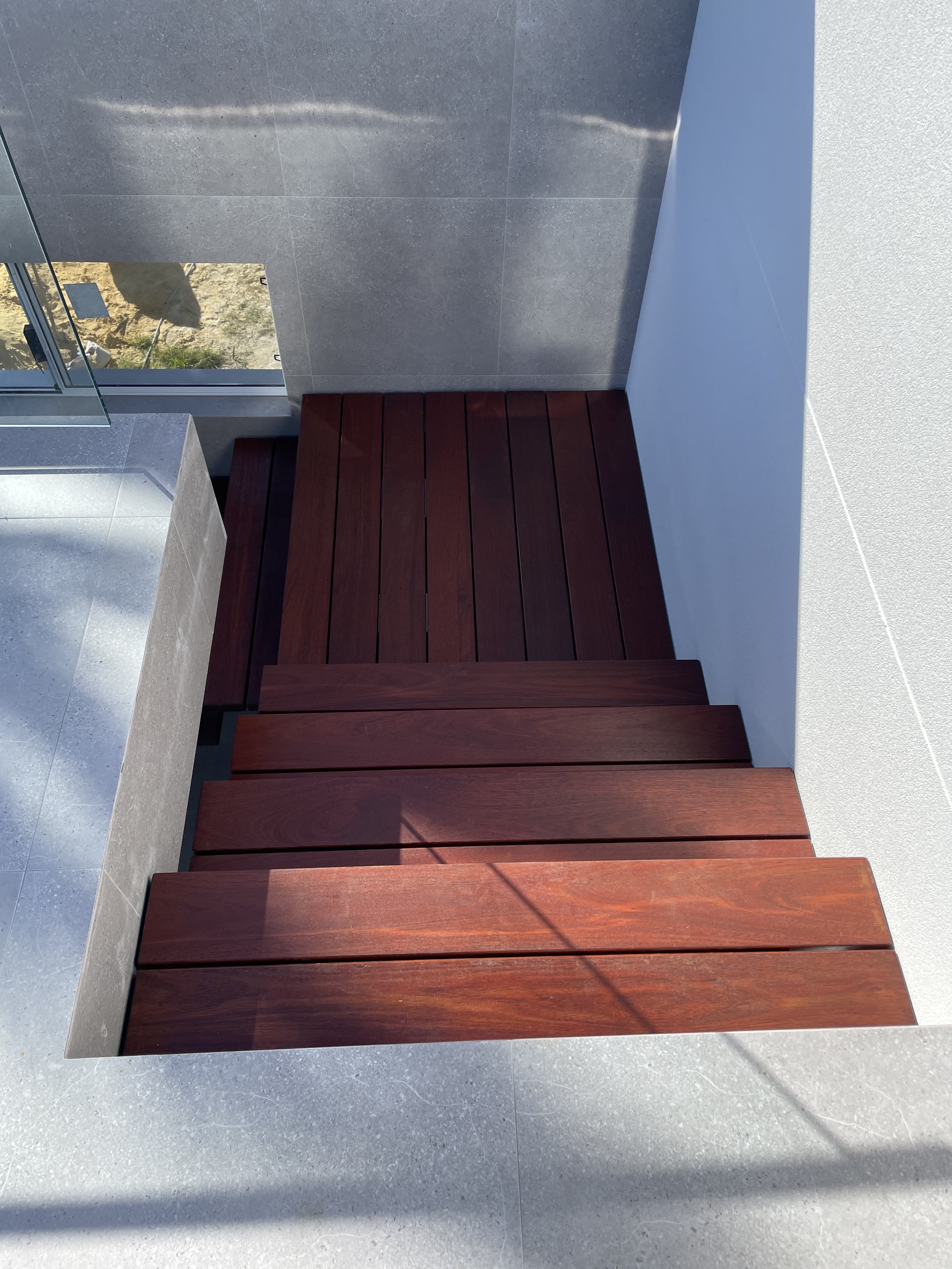 A modern external staircase located in Jindalee featuring a sleek mono stringer design with rich Jarrah Timber Treads. The design enhances both function and style, perfect for a minimalist architectural aesthetic. Ideal for outdoor residential use.