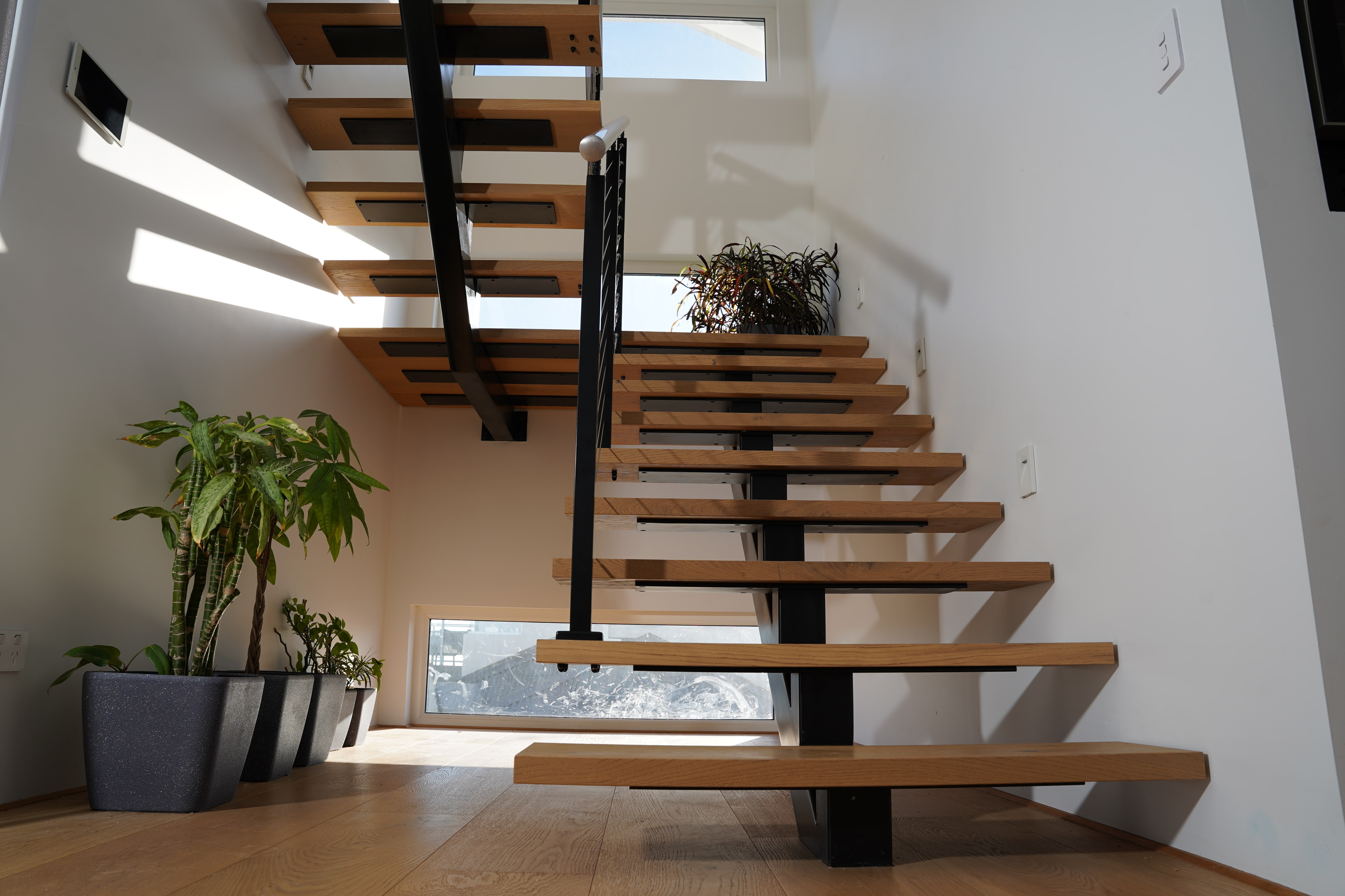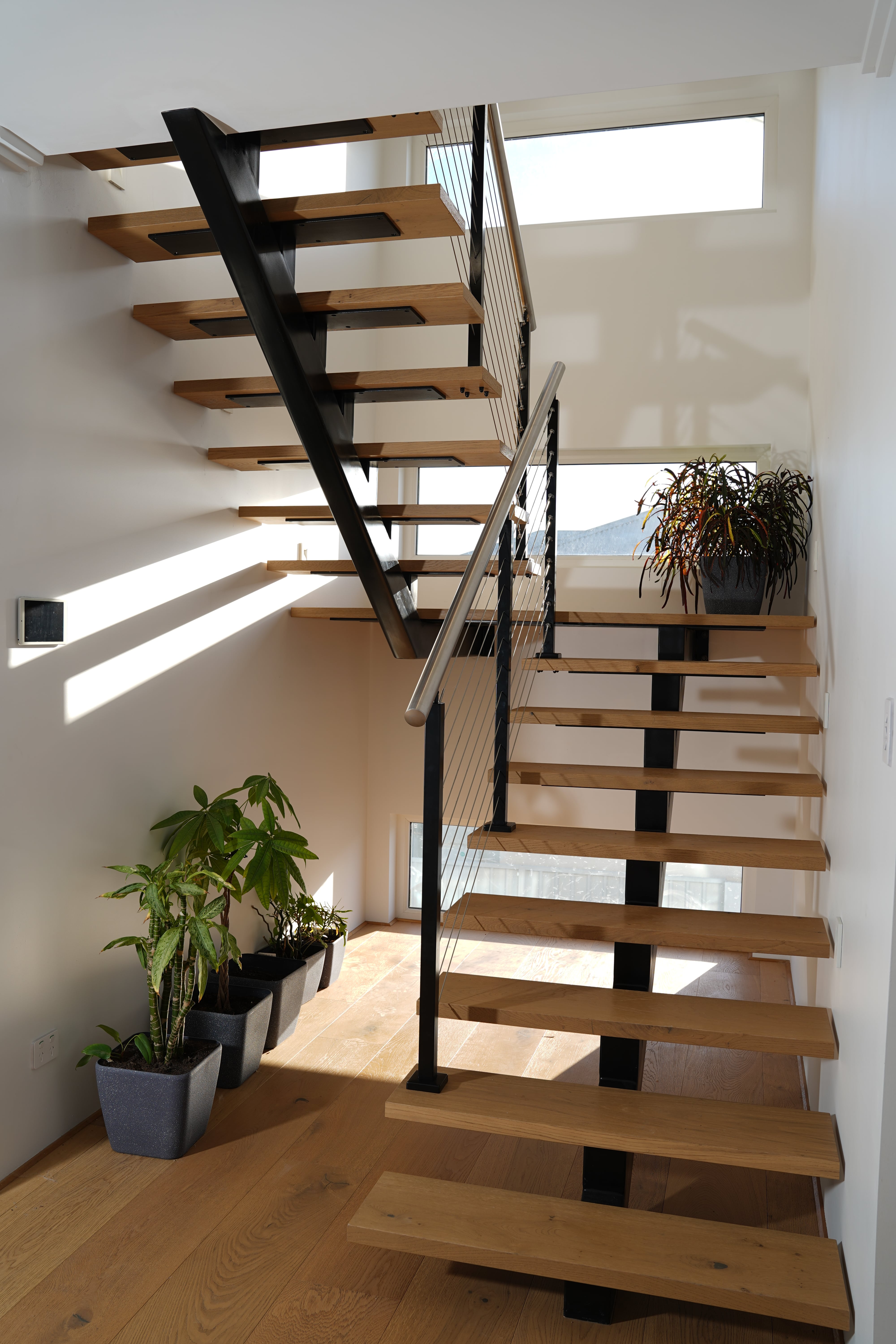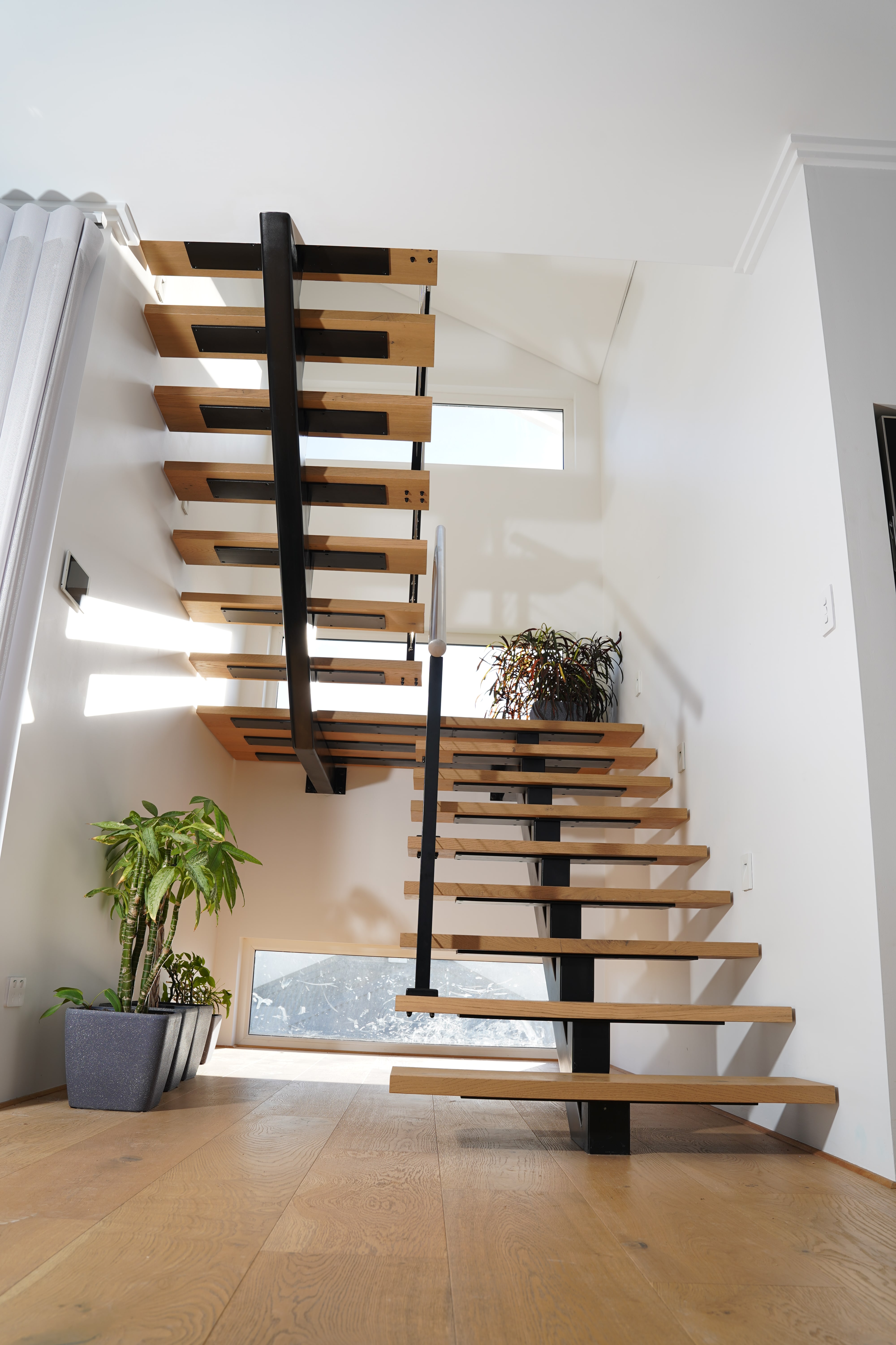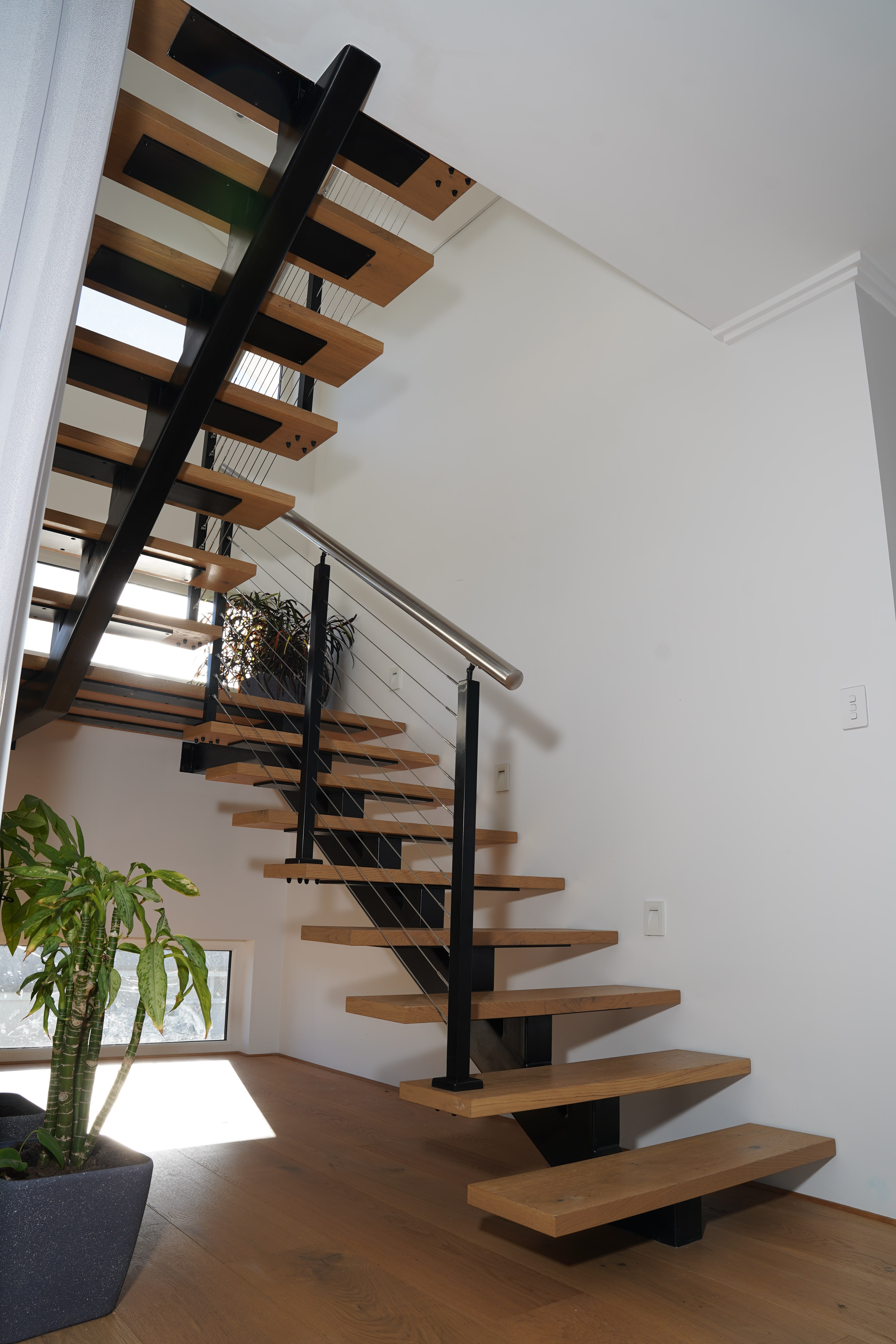 The Jindlee Mono Wire staircase showcases a modern U-shaped mono stringer design, paired with clean American Oak treads. Featuring a sleek stainless steel wire balustrade and powder-coated black steel posts, this design blends industrial minimalism with natural timber warmth. Designed for a bright residential setting, the staircase brings open-air elegance to a double-height space while maximizing light and visibility.