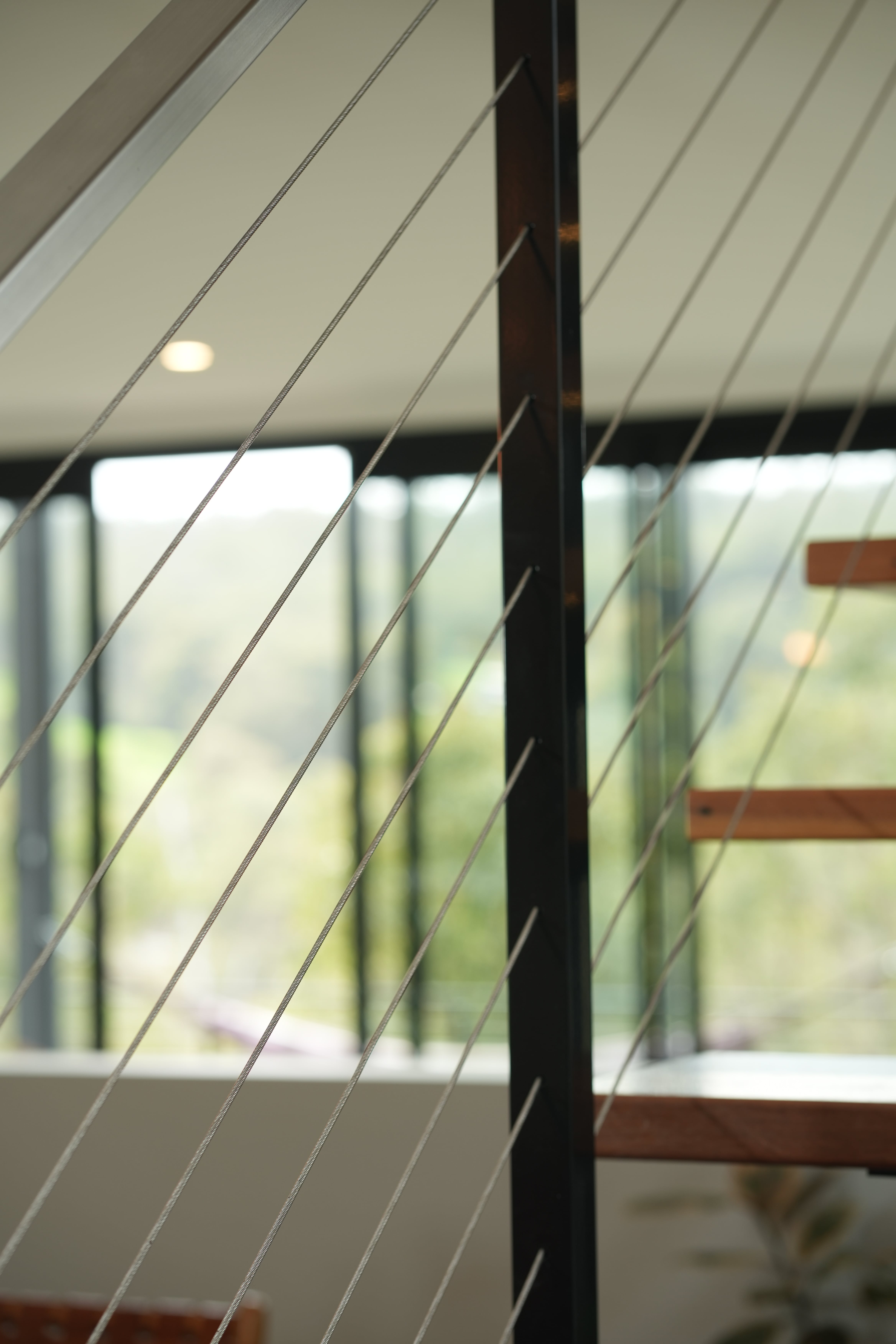 The Piesse Brook staircase features rich Jarrah treads on a mono stringer frame, complemented by sleek wire balustrading and a brushed stainless handrail, offering an airy and modern feel with views of the natural surroundings.