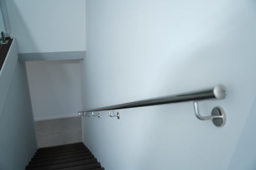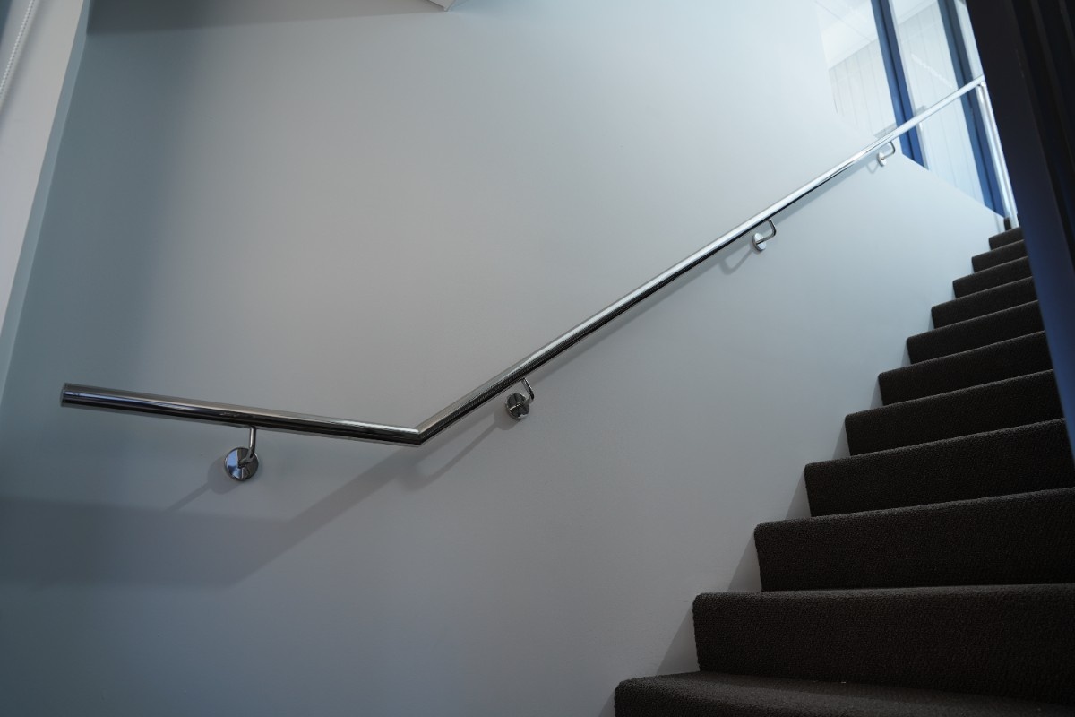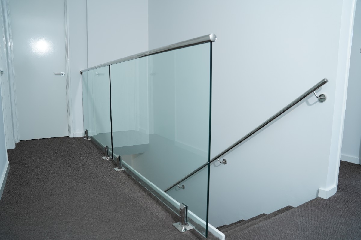 A residential straight stair with a brushed stainless steel handrail (Ø50.8mm) mounted on the wall. The stair is complemented by a glass side-fix balustrade system, supported by stainless steel clamps for a sleek, modern look. Ideal for contemporary interiors, this setup enhances safety while maintaining a minimalist aesthetic.