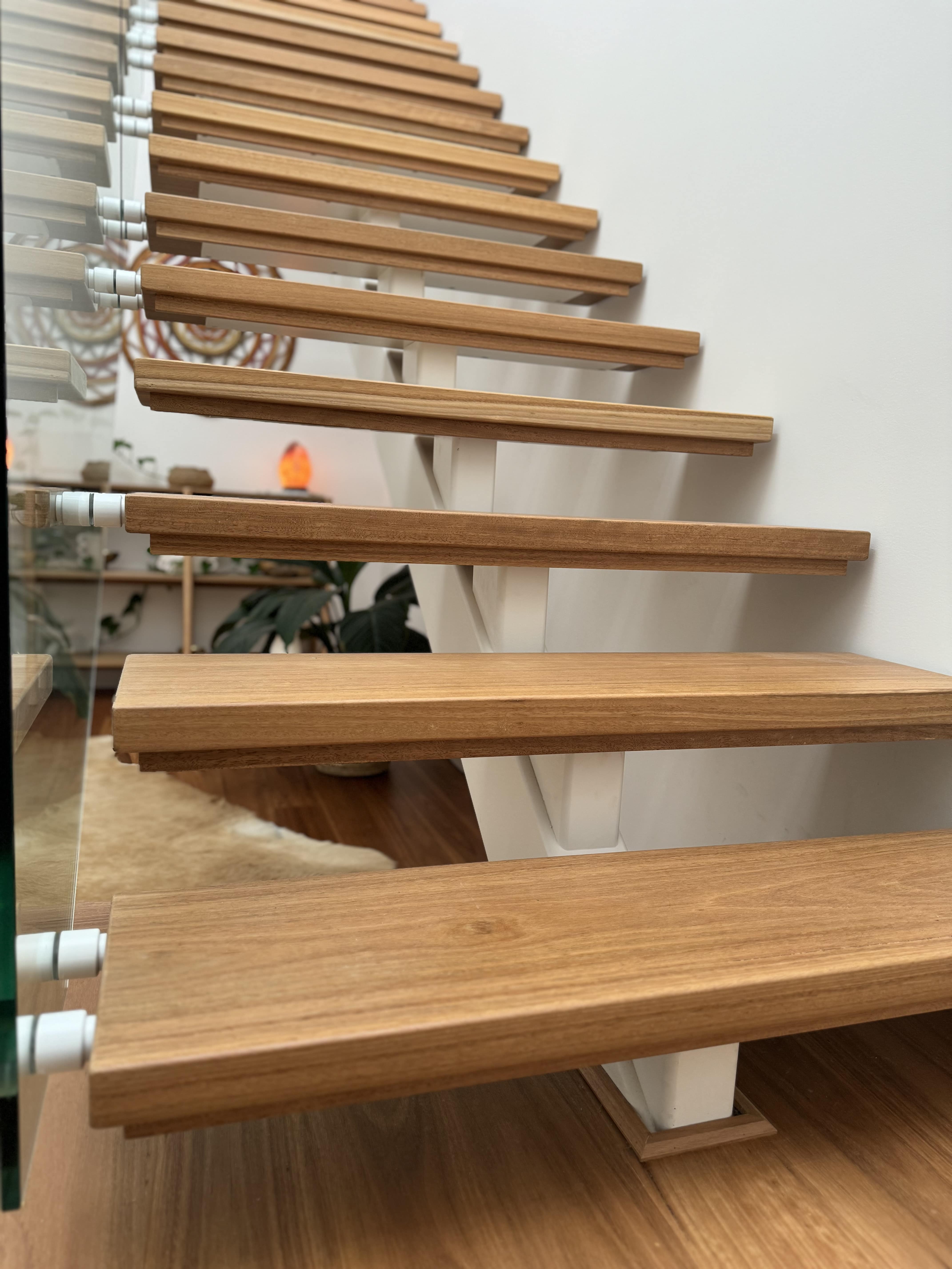 A clean and elegant L-shaped staircase featuring rich American Oak treads supported by a sleek mono stringer design. The side-fixed glass balustrade with a minimalist white powder-coated handrail enhances the modern interior, making it a stylish centerpiece in this South Perth home.