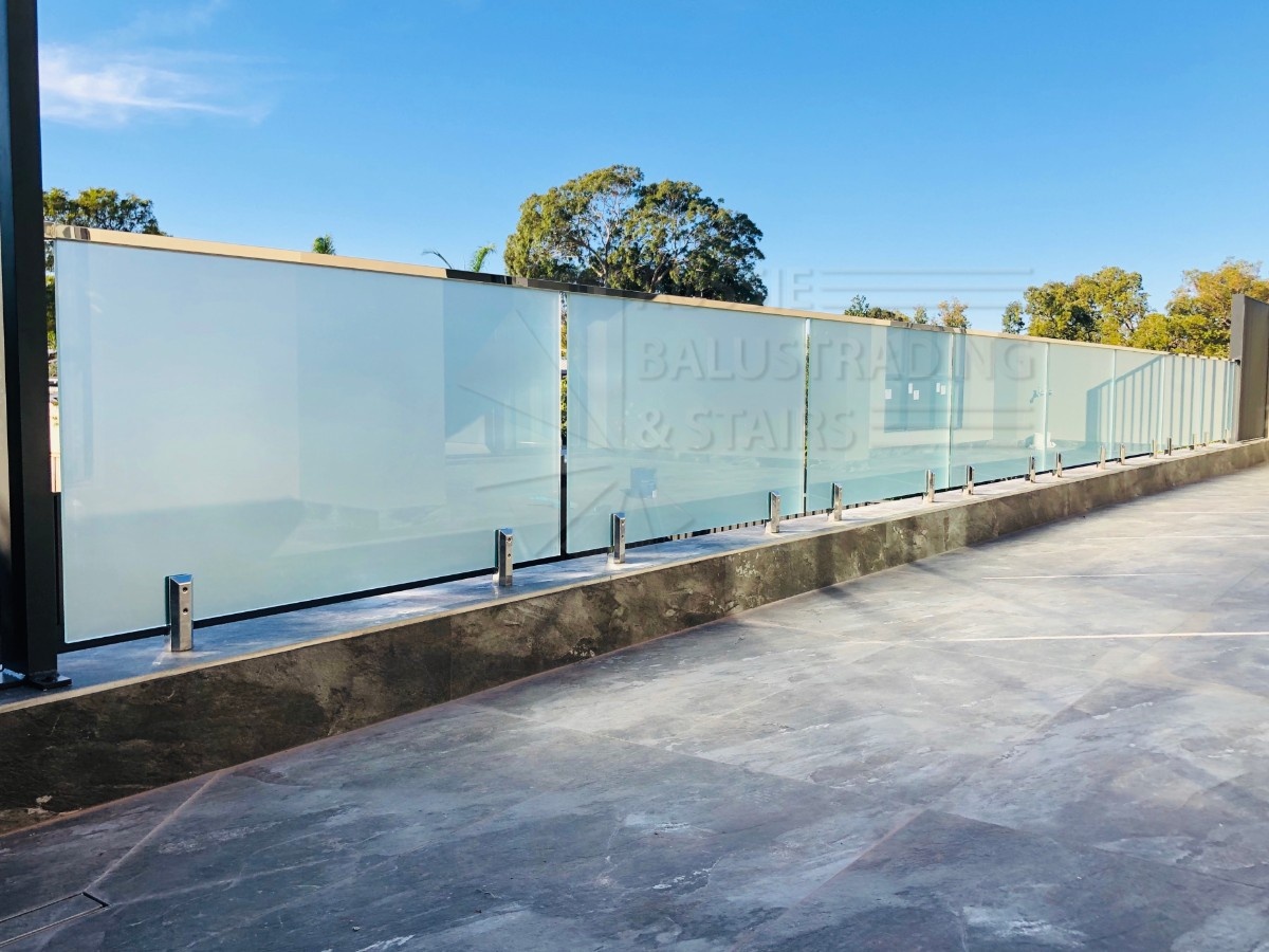 Elegant top-fixed frosted glass balustrade system featuring polished stainless steel spigots and a sleek stainless steel top rail. Designed for privacy without compromising aesthetics, ideal for balconies and decks with modern architecture.
